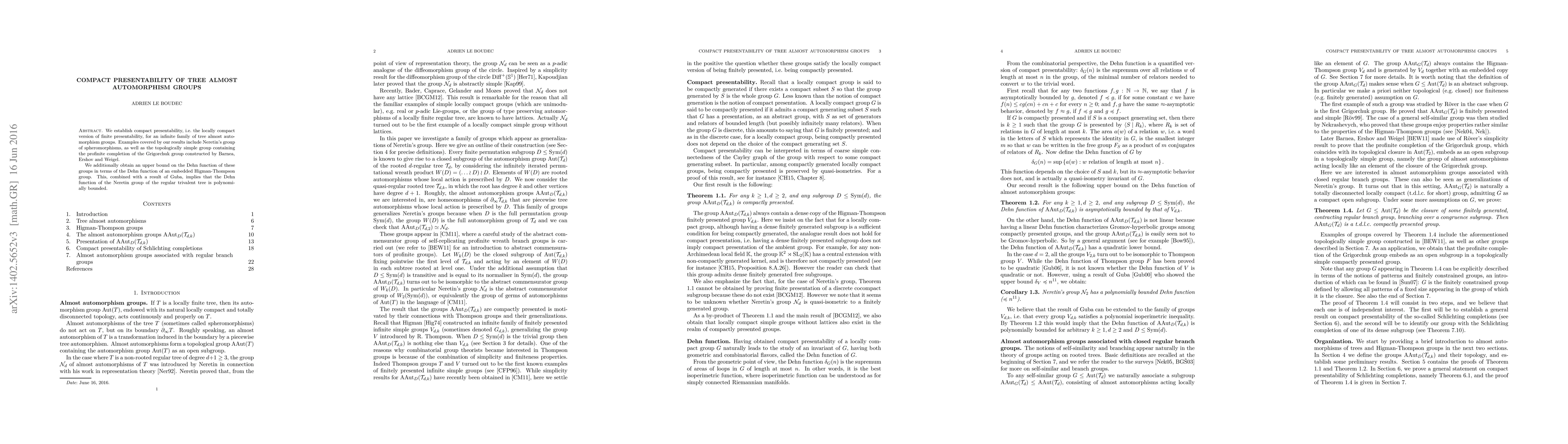 This paper establishes compact presentability for a family of tree almost automorphism groups, including Neretin's group and a topologically simple group. The authors also provide an upper bound on the Dehn function of these groups, showing that the Dehn function of the Neretin group is polynomially bounded.