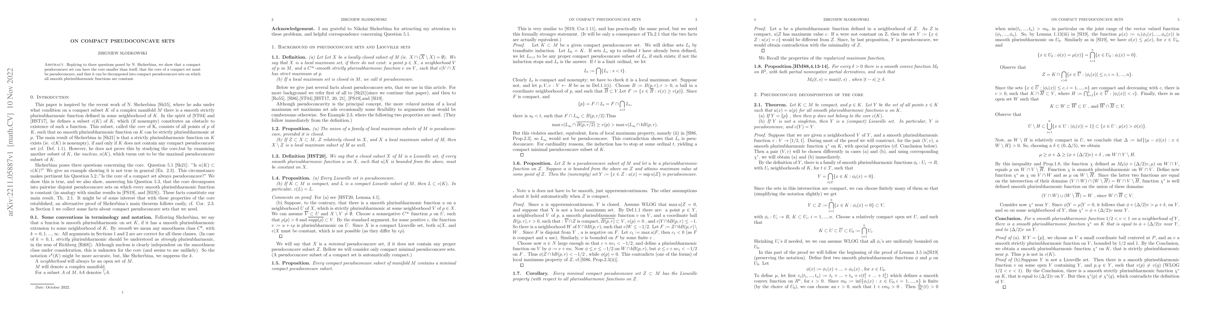 Summary: This paper addresses three questions regarding compact pseudoconcave sets, demonstrating that their core can be smaller, the core itself must be pseudoconcave, and they can be decomposed into smaller compact pseudoconcave sets where smooth plurisubharmonic functions are constant.