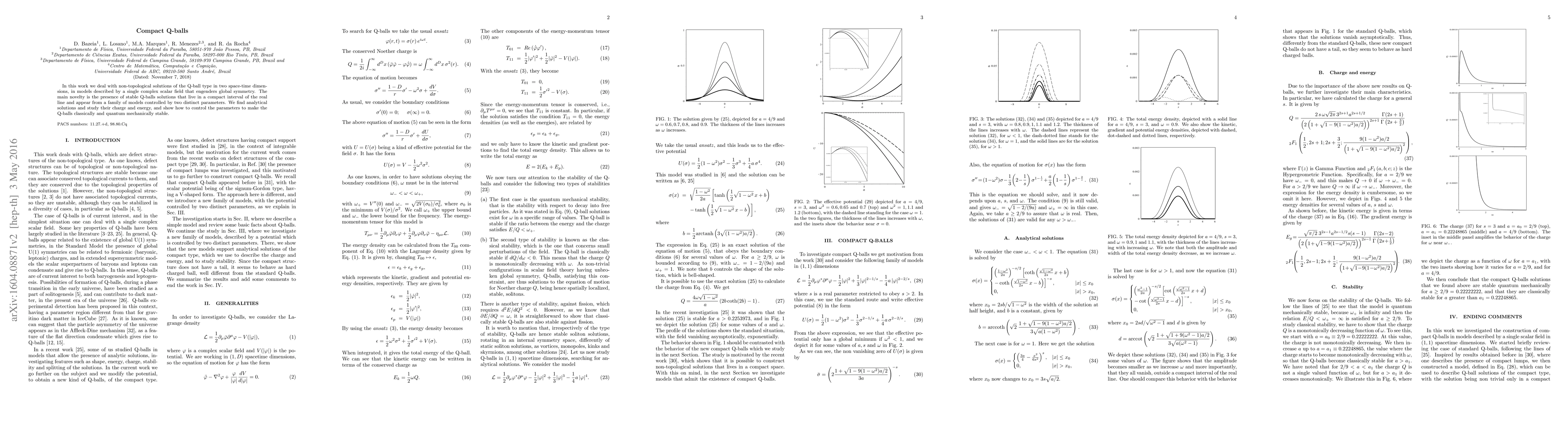 In this work we deal with non-topological solutions of the Q-ball type in two space-time dimensions, in models described by a single complex scalar field that engenders global symmetry. The main novelty is the presence of stable Q-balls solutions that live in a compact interval of the real line and appear from a family of models controlled by two distinct parameters. We find analytical solutions and study their charge and energy, and show how to control the parameters to make the Q-balls classically and quantum mechanically stable.
