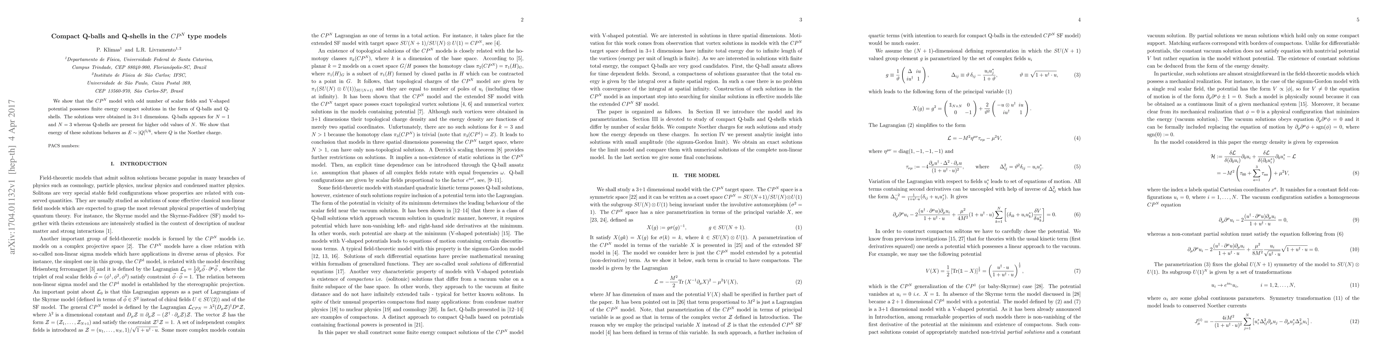 Summary: The CPN model with odd scalar fields and a V-shaped potential exhibits finite energy compact solutions called Q-balls and Q-shells in 3+1 dimensions, with Q-balls occurring for N=1 and N=3, and Q-shells for higher odd N values, demonstrating an energy scaling of E~|Q|^5/6 with the Noether charge Q.