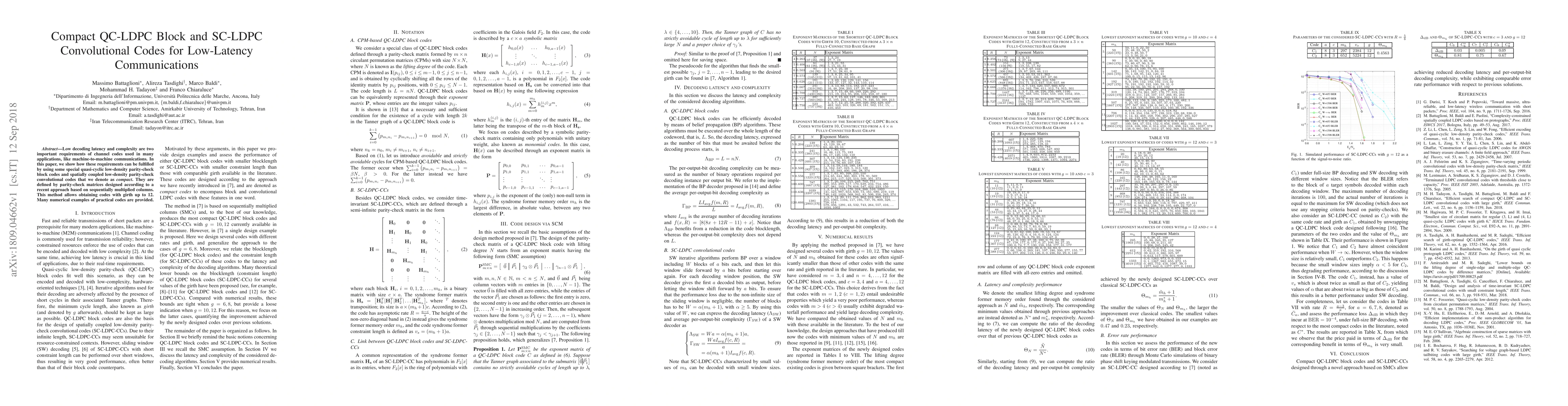 Low decoding latency and complexity are two important requirements of channel codes used in many applications, like machine-to-machine communications. In this paper, we show how these requirements can be fulfilled by using some special quasi-cyclic low-density parity-check block codes and spatially coupled low-density parity-check convolutional codes that we denote as compact. They are defined by parity-check matrices designed according to a recent approach based on sequentially multiplied columns. This method allows obtaining codes with girth up to 12. Many numerical examples of practical codes are provided.
