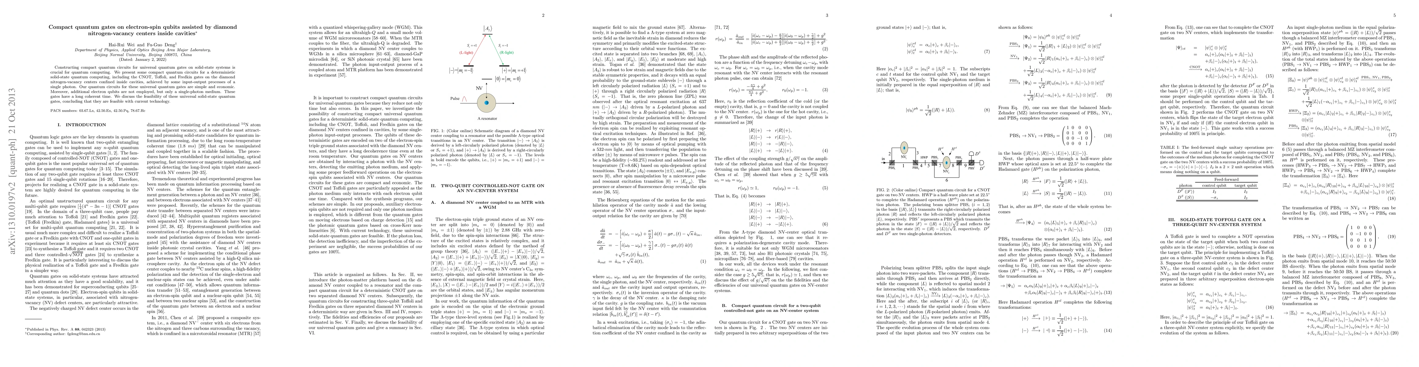 This paper proposes compact quantum circuits for universal quantum gates (CNOT, Toffoli, Fredkin) using electron-spin qubits in diamond nitrogen-vacancy centers inside cavities, driven by single-photon input-output processes. The proposed circuits are simple, cost-effective, and utilize only a single-photon medium without requiring additional electron qubits, demonstrating feasibility with current technology.