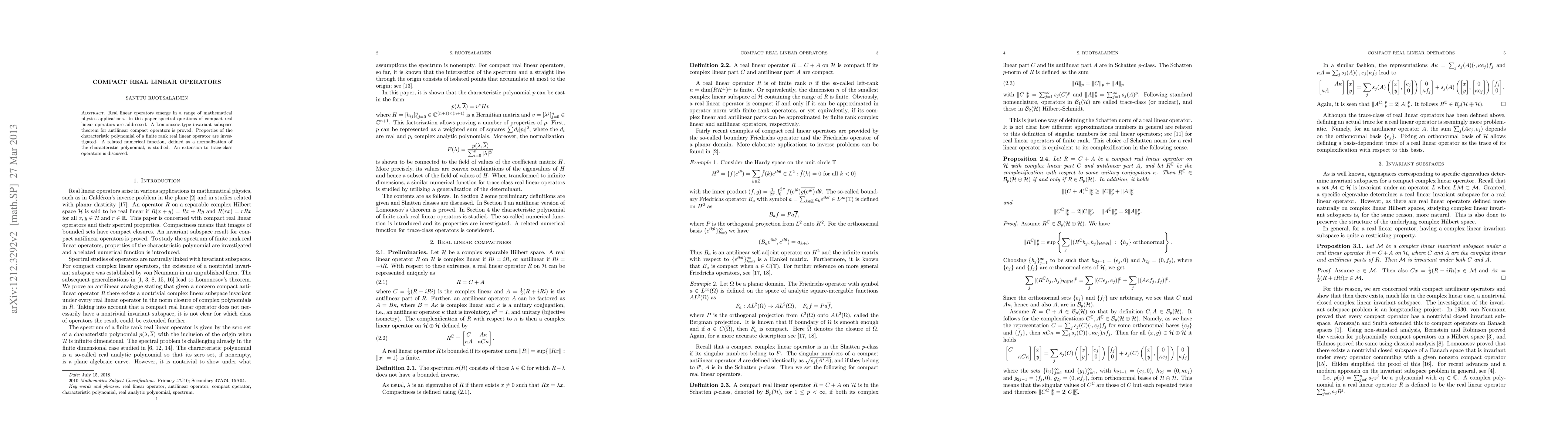 This paper investigates spectral properties of compact real linear operators, proving a Lomonosov-type invariant subspace theorem for antilinear compact operators and exploring the characteristic polynomial of finite rank real linear operators, including a related normalization function and extending findings to trace-class operators.