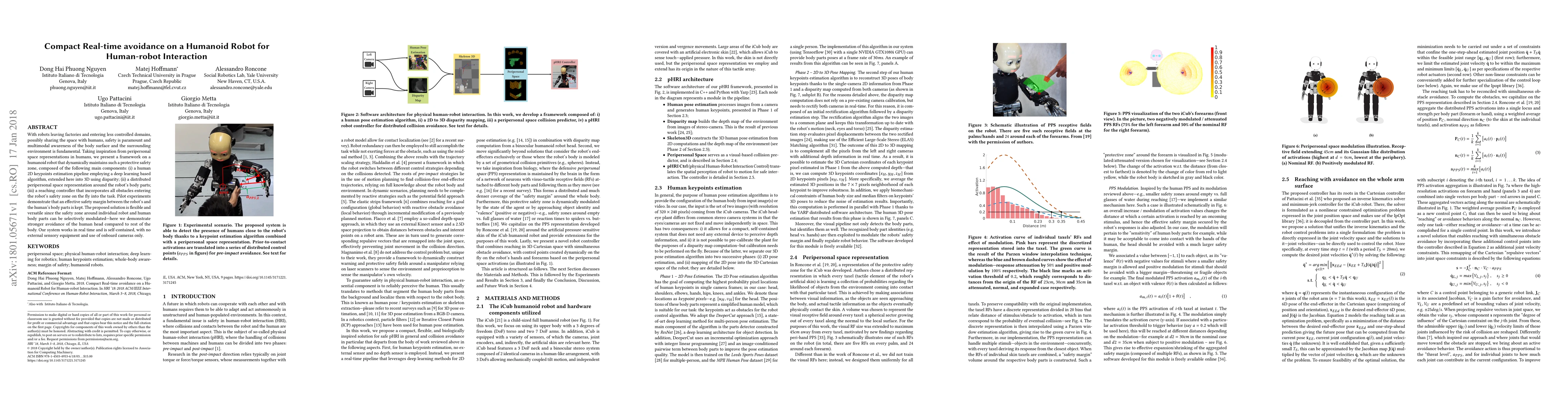 With robots leaving factories and entering less controlled domains, possibly sharing the space with humans, safety is paramount and multimodal awareness of the body surface and the surrounding environment is fundamental. Taking inspiration from peripersonal space representations in humans, we present a framework on a humanoid robot that dynamically maintains such a protective safety zone, composed of the following main components: (i) a human 2D keypoints estimation pipeline employing a deep learning based algorithm, extended here into 3D using disparity; (ii) a distributed peripersonal space representation around the robot's body parts; (iii) a reaching controller that incorporates all obstacles entering the robot's safety zone on the fly into the task. Pilot experiments demonstrate that an effective safety margin between the robot's and the human's body parts is kept. The proposed solution is flexible and versatile since the safety zone around individual robot and human body parts can be selectively modulated---here we demonstrate stronger avoidance of the human head compared to rest of the body. Our system works in real time and is self-contained, with no external sensory equipment and use of onboard cameras only.