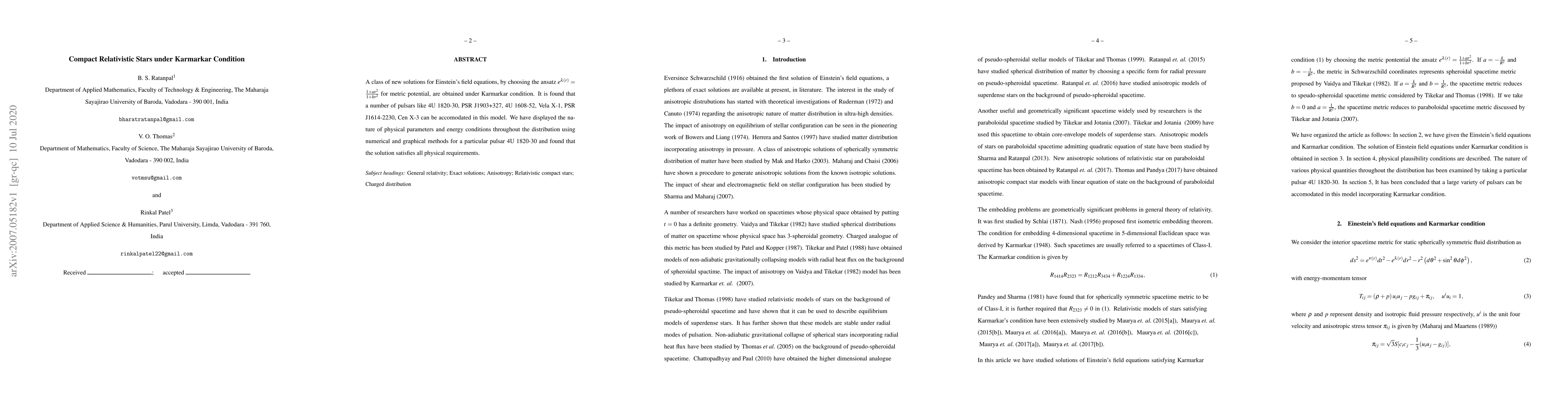 This paper presents new solutions to Einstein's field equations using a specific metric potential ansatz under the Karmarkar condition, which accommodates several pulsars. The solution for pulsar 4U 1820-30 satisfies all physical requirements, as demonstrated through numerical and graphical analysis.