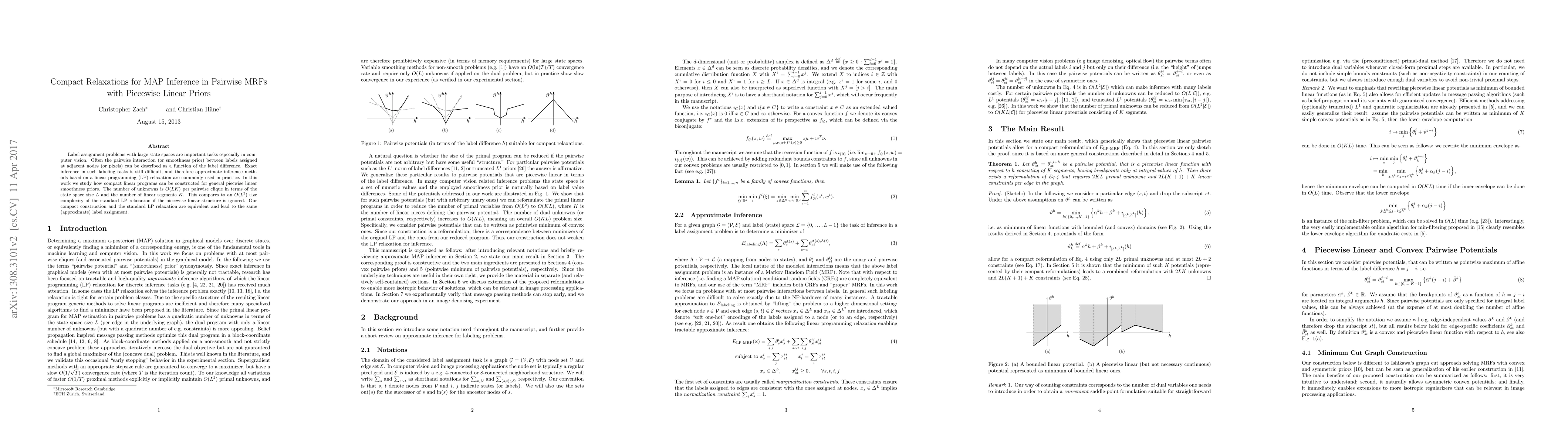Label assignment problems with large state spaces are important tasks especially in computer vision. Often the pairwise interaction (or smoothness prior) between labels assigned at adjacent nodes (or pixels) can be described as a function of the label difference. Exact inference in such labeling tasks is still difficult, and therefore approximate inference methods based on a linear programming (LP) relaxation are commonly used in practice. In this work we study how compact linear programs can be constructed for general piecwise linear smoothness priors. The number of unknowns is O(LK) per pairwise clique in terms of the state space size $L$ and the number of linear segments K. This compares to an O(L^2) size complexity of the standard LP relaxation if the piecewise linear structure is ignored. Our compact construction and the standard LP relaxation are equivalent and lead to the same (approximate) label assignment.