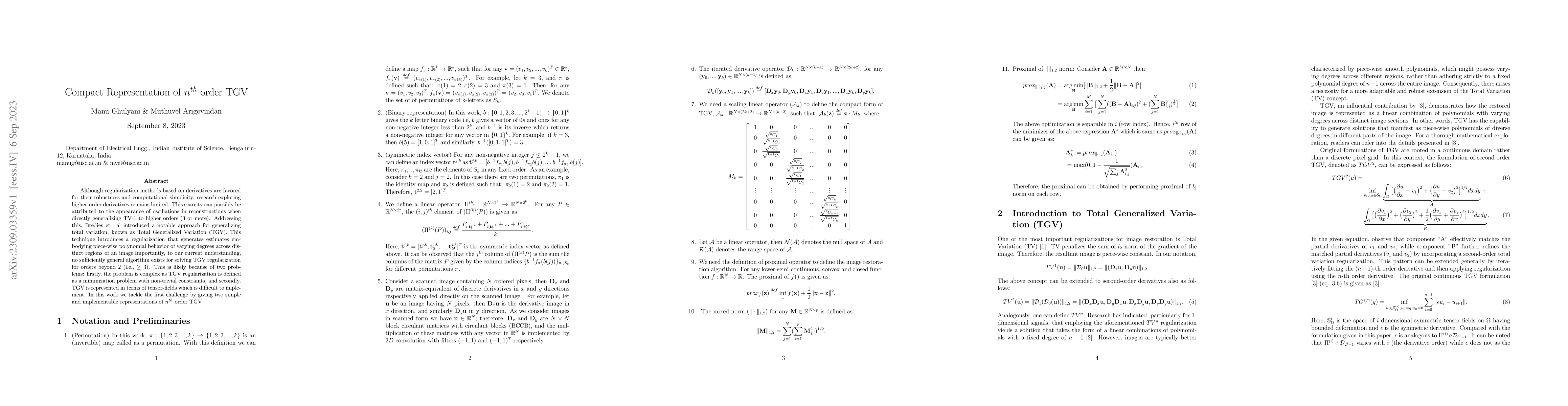 This paper proposes two compact representations for solving n-th order Total Generalized Variation (TGV) regularization, addressing the complexity and tensor-field implementation issues that hinder higher-order generalizations. The new representations aim to facilitate robust and computationally efficient image reconstructions.