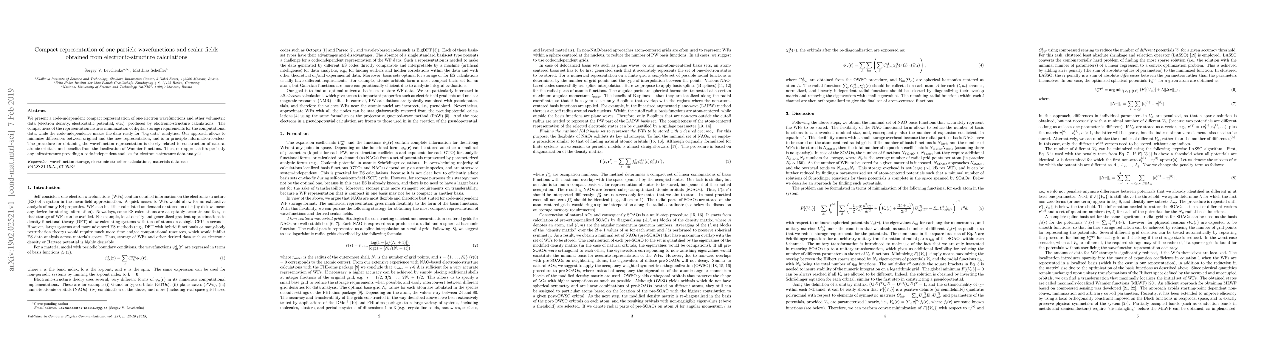 We present a code-independent compact representation of one-electron wavefunctions and other volumetric data (electron density, electrostatic potential, etc.) produced by electronic-structure calculations. The compactness of the representation insures minimization of digital storage requirements for the computational data, while the code-independence makes the data ready for "big data" analytics. Our approach allows to minimize differences between original and the new representation, and is in principle information-lossless. The procedure for obtaining the wavefunction representation is closely related to construction of natural atomic orbitals, and benefits from the localization of Wannier functions. Thus, our approach fits perfectly any infrastructure providing a code-independent tool set for electronic-structure data analysis.