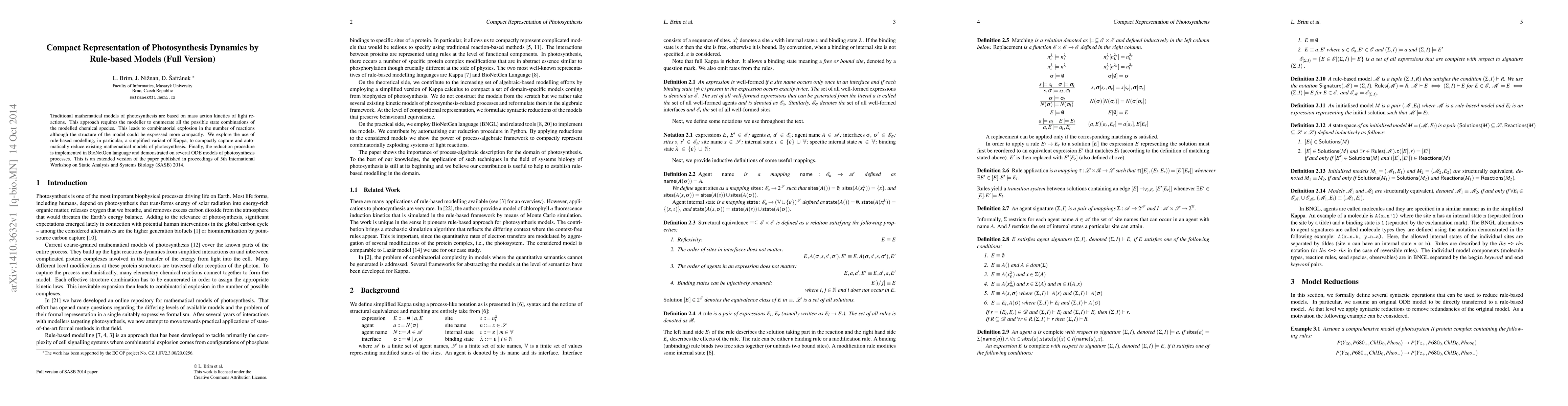 Traditional mathematical models of photosynthesis are based on mass action kinetics of light reactions. This approach requires the modeller to enumerate all the possible state combinations of the modelled chemical species. This leads to combinatorial explosion in the number of reactions although the structure of the model could be expressed more compactly. We explore the use of rule-based modelling, in particular, a simplified variant of Kappa, to compactly capture and automatically reduce existing mathematical models of photosynthesis. Finally, the reduction procedure is implemented in BioNetGen language and demonstrated on several ODE models of photosynthesis processes. This is an extended version of the paper published in proceedings of 5th International Workshop on Static Analysis and Systems Biology (SASB) 2014.