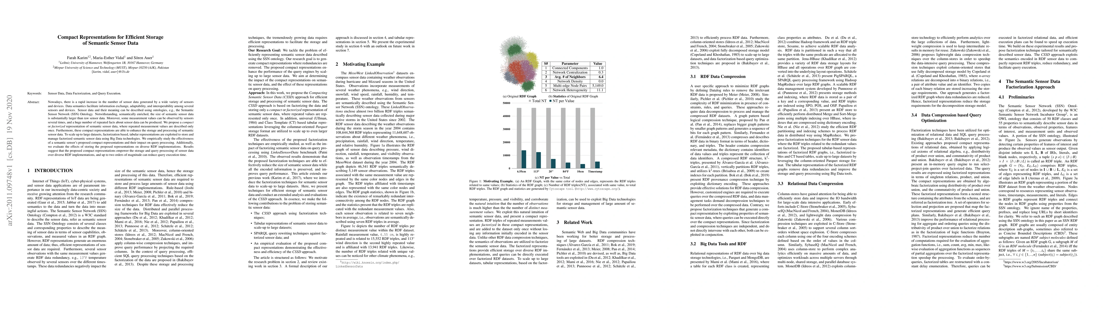 This paper proposes a compact representation of semantic sensor data that minimizes storage by factorizing repeated measurement values, enhancing storage efficiency and query processing speed. The proposed method leverages Big Data technologies for scalability and demonstrates significant reductions in query execution time across various RDF implementations.