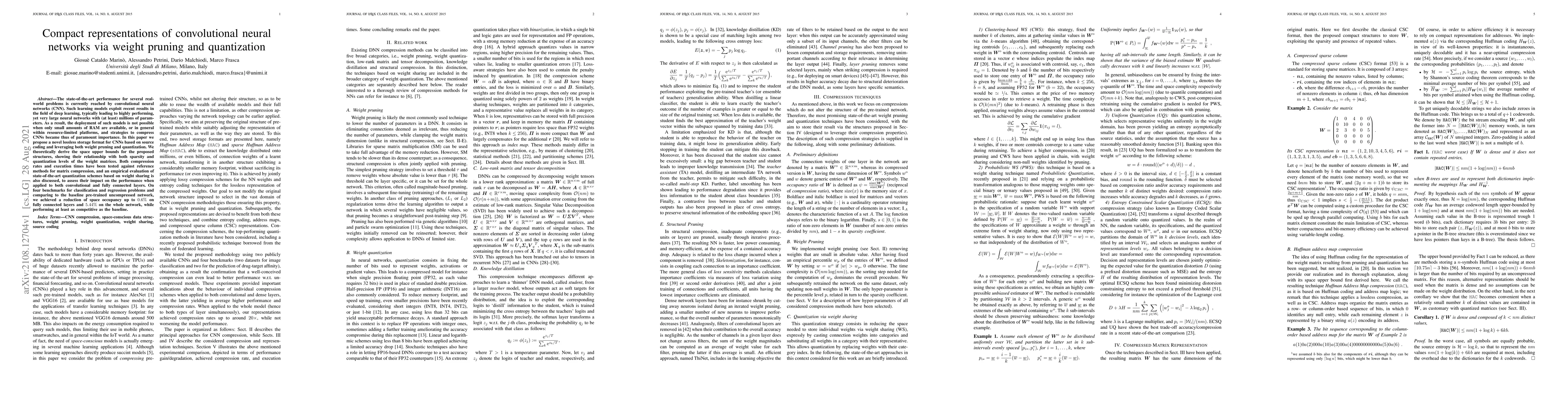 This paper proposes a novel method for compressing convolutional neural networks (CNNs) using weight pruning and quantization, achieving significant reductions in space occupancy without compromising performance. The approach leverages theoretical bounds and empirical evaluations to demonstrate its effectiveness in resource-limited environments.