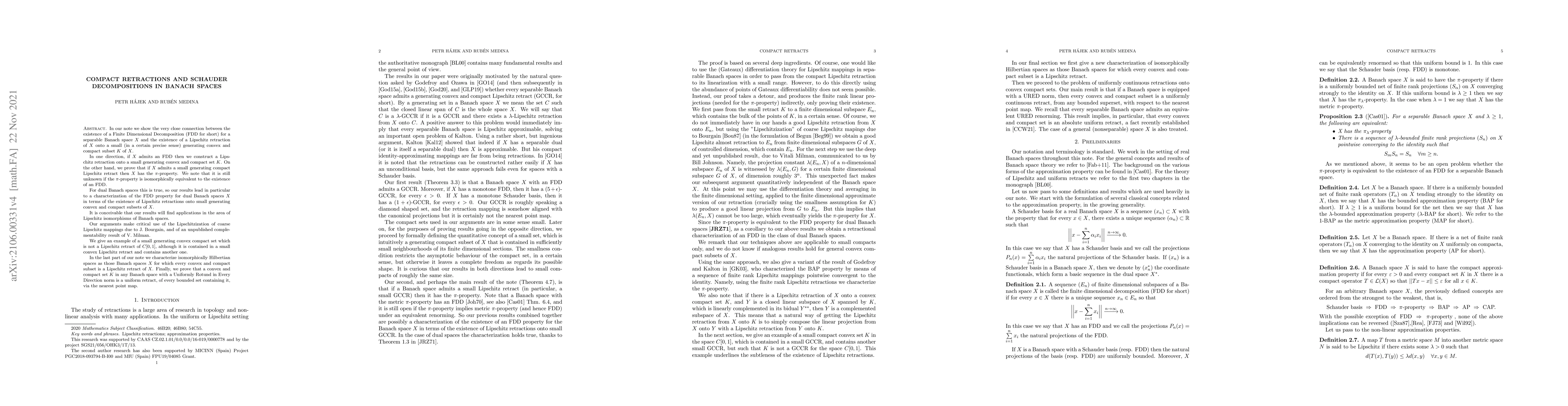 In our note we show the very close connection between the existence of a Finite Dimensional Decomposition (FDD for short) for a separable Banach space $X$ and the existence of a Lipschitz retraction of $X$ onto a small (in a certain precise sense) generating convex and compact subset $K$ of $X$. In one direction, if $X$ admits an FDD then we construct a Lipschitz retraction onto a small generating convex and compact set $K$. On the other hand, we prove that if $X$ admits a small generating compact Lipschitz retract then $X$ has the $\pi$-property. We note that it is still unknown if the $\pi$-property is isomorphically equivalent to the existence of an FDD. For dual Banach spaces this is true, so our results lead in particular to a characterization of the FDD property for dual Banach spaces $X$ in terms of the existence of Lipschitz retractions onto small generating convex and compact subsets of $X$. It is conceivable that our results will find applications in the area of Lipschitz isomorphisms of Banach spaces. Our arguments make critical use of the Lipschitzization of coarse Lipschitz mappings due to J. Bourgain, and of an unpublished complementability result of V. Milman. We give an example of a small generating convex compact set which is not a Lipschitz retract of $C[0,1]$, although it is contained in a small convex Lipschitz retract and contains another one. In the last part of our note we characterize isomorphically Hilbertian spaces as those Banach spaces $X$ for which every convex and compact subset is a Lipschitz retract of $X$. Finally, we prove that a convex and compact set $K$ in any Banach space with a Uniformly Rotund in Every Direction norm is a uniform retract, of every bounded set containing it, via the nearest point map.