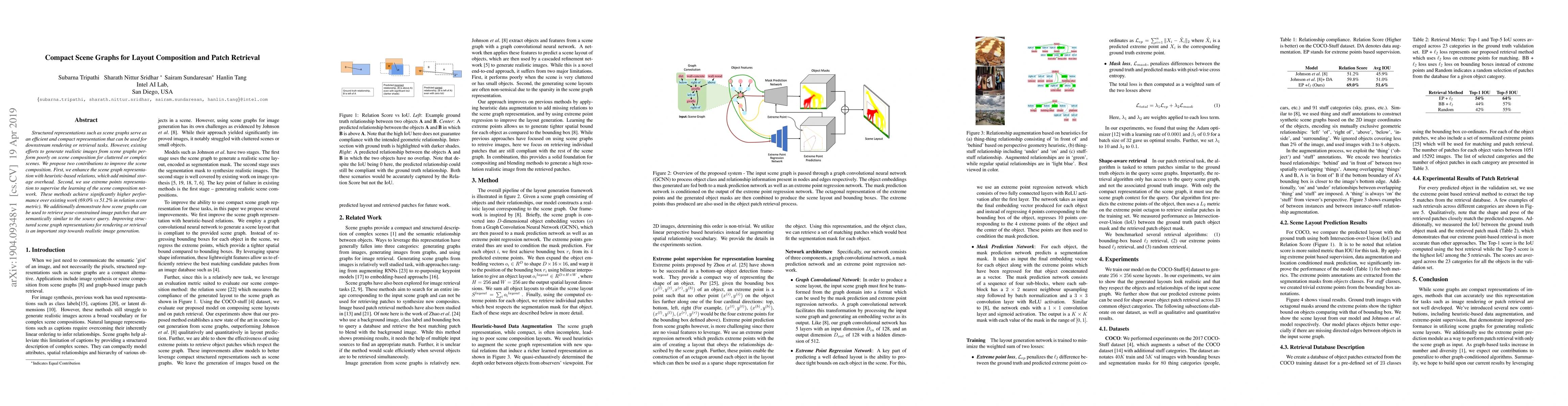 Structured representations such as scene graphs serve as an efficient and compact representation that can be used for downstream rendering or retrieval tasks. However, existing efforts to generate realistic images from scene graphs perform poorly on scene composition for cluttered or complex scenes. We propose two contributions to improve the scene composition. First, we enhance the scene graph representation with heuristic-based relations, which add minimal storage overhead. Second, we use extreme points representation to supervise the learning of the scene composition network. These methods achieve significantly higher performance over existing work (69.0% vs 51.2% in relation score metric). We additionally demonstrate how scene graphs can be used to retrieve pose-constrained image patches that are semantically similar to the source query. Improving structured scene graph representations for rendering or retrieval is an important step towards realistic image generation.