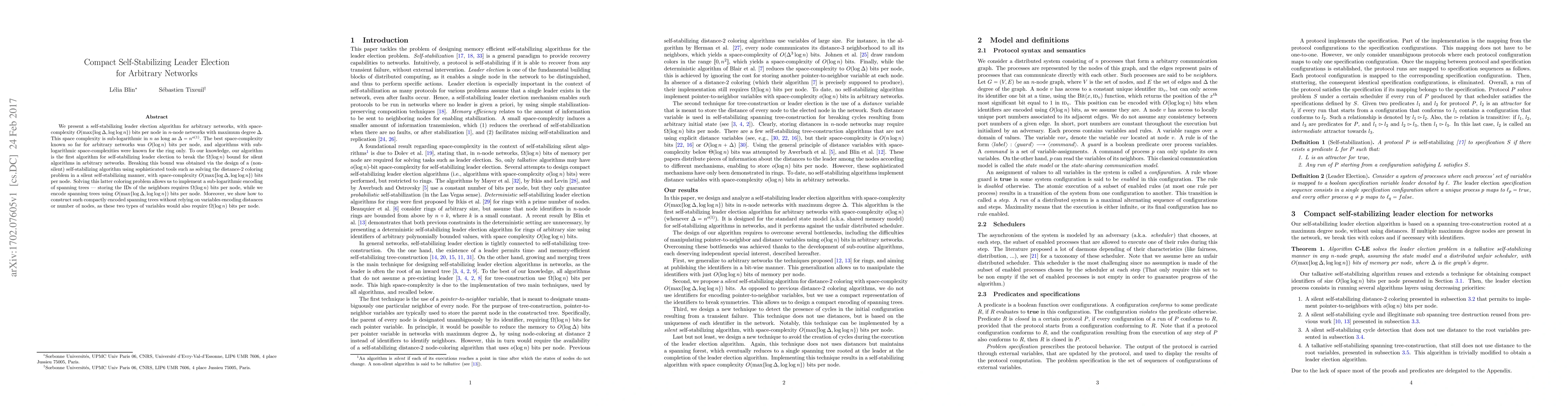 We present a self-stabilizing leader election algorithm for arbitrary networks, with space-complexity $O(\max\{\log \Delta, \log \log n\})$ bits per node in $n$-node networks with maximum degree~$\Delta$. This space complexity is sub-logarithmic in $n$ as long as $\Delta = n^{o(1)}$. The best space-complexity known so far for arbitrary networks was $O(\log n)$ bits per node, and algorithms with sub-logarithmic space-complexities were known for the ring only. To our knowledge, our algorithm is the first algorithm for self-stabilizing leader election to break the $\Omega(\log n)$ bound for silent algorithms in arbitrary networks. Breaking this bound was obtained via the design of a (non-silent) self-stabilizing algorithm using sophisticated tools such as solving the distance-2 coloring problem in a silent self-stabilizing manner, with space-complexity $O(\max\{\log \Delta, \log \log n\})$ bits per node. Solving this latter coloring problem allows us to implement a sub-logarithmic encoding of spanning trees --- storing the IDs of the neighbors requires $\Omega(\log n)$ bits per node, while we encode spanning trees using $O(\max\{\log \Delta, \log \log n\})$ bits per node. Moreover, we show how to construct such compactly encoded spanning trees without relying on variables encoding distances or number of nodes, as these two types of variables would also require $\Omega(\log n)$ bits per node.