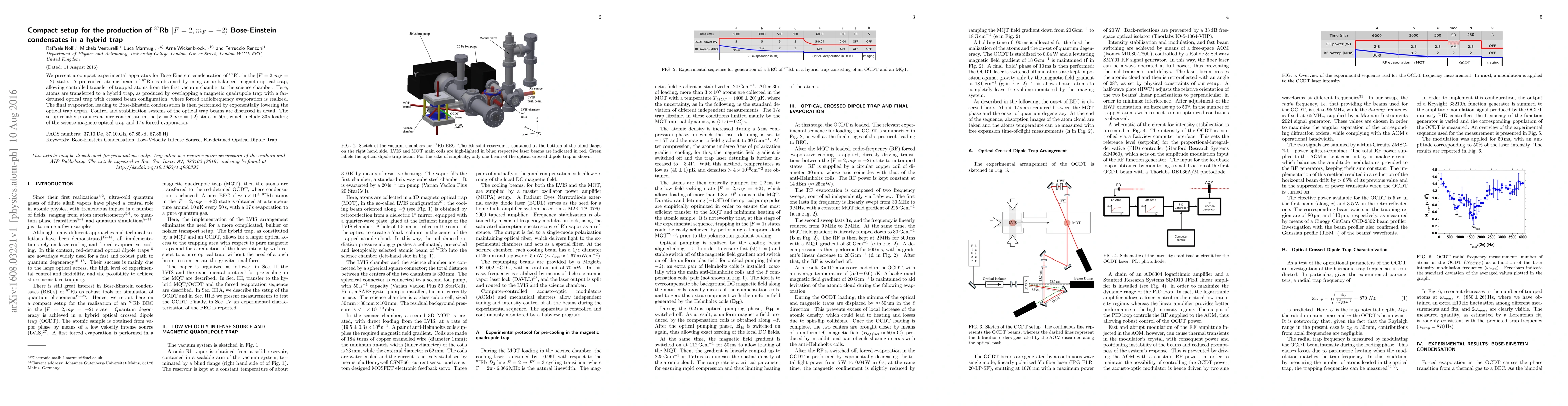 We present a compact experimental apparatus for Bose-Einstein condensation of $^{87}$Rb in the $|F = 2, m_F = +2\rangle$ state. A pre-cooled atomic beam of $^{87}$Rb is obtained by using an unbalanced magneto-optical trap, allowing controlled transfer of trapped atoms from the first vacuum chamber to the science chamber. Here, atoms are transferred to a hybrid trap, as produced by overlapping a magnetic quadrupole trap with a far-detuned optical trap with crossed beam configuration, where forced radiofrequency evaporation is realized. The final evaporation leading to Bose-Einstein condensation is then performed by exponentially lowering the optical trap depth. Control and stabilization systems of the optical trap beams are discussed in detail. The setup reliably produces a pure condensate in the $|F = 2, m_F = +2\rangle$ state in 50 s, which include 33 s loading of the science magneto-optical trap and 17 s forced evaporation.