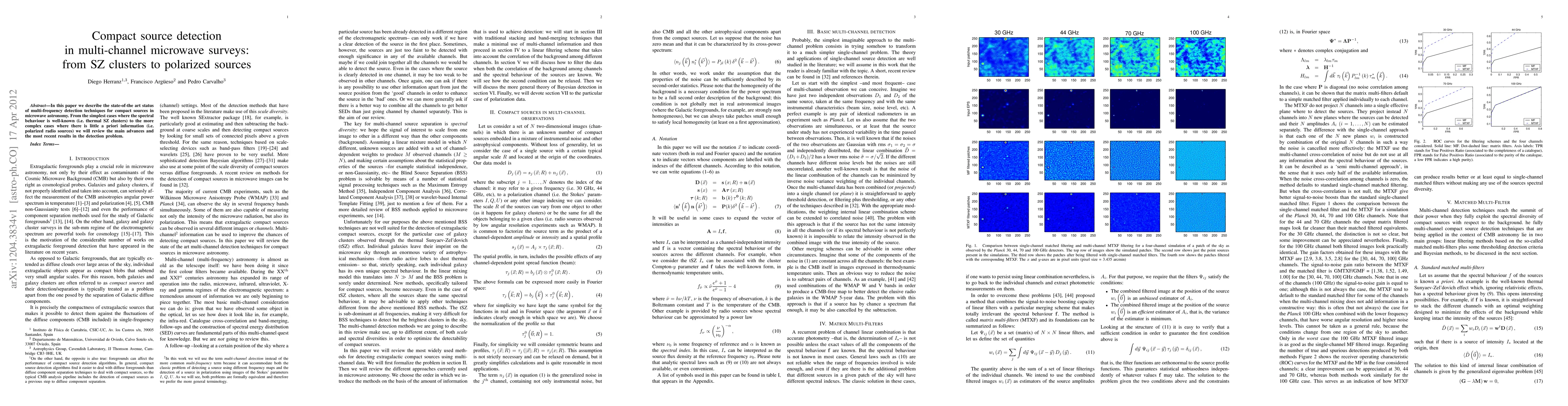 In this paper we describe the state-of-the art status of multi-frequency detection techniques for compact sources in microwave astronomy. From the simplest cases where the spectral behaviour is well-known (i.e. thermal SZ clusters) to the more complex cases where there is little a priori information (i.e. polarized radio sources) we will review the main advances and the most recent results in the detection problem.