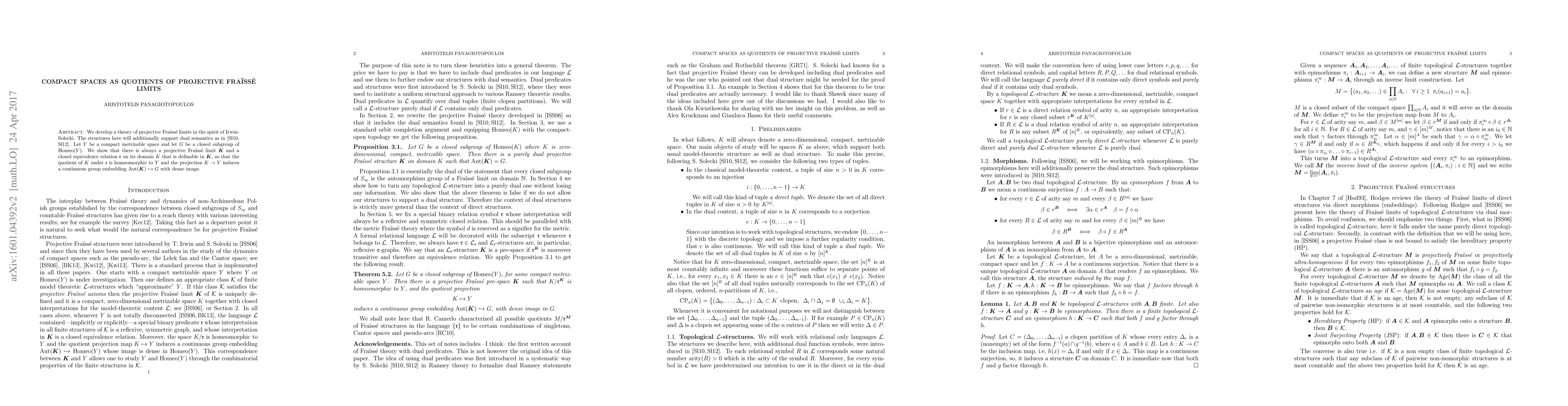 A compact metrizable space Y is shown to have a projective Fraisse limit K with a closed definable equivalence relation r, where the quotient of K under r is homeomorphic to Y and the group embedding of Aut(K) into G is continuous with dense image.