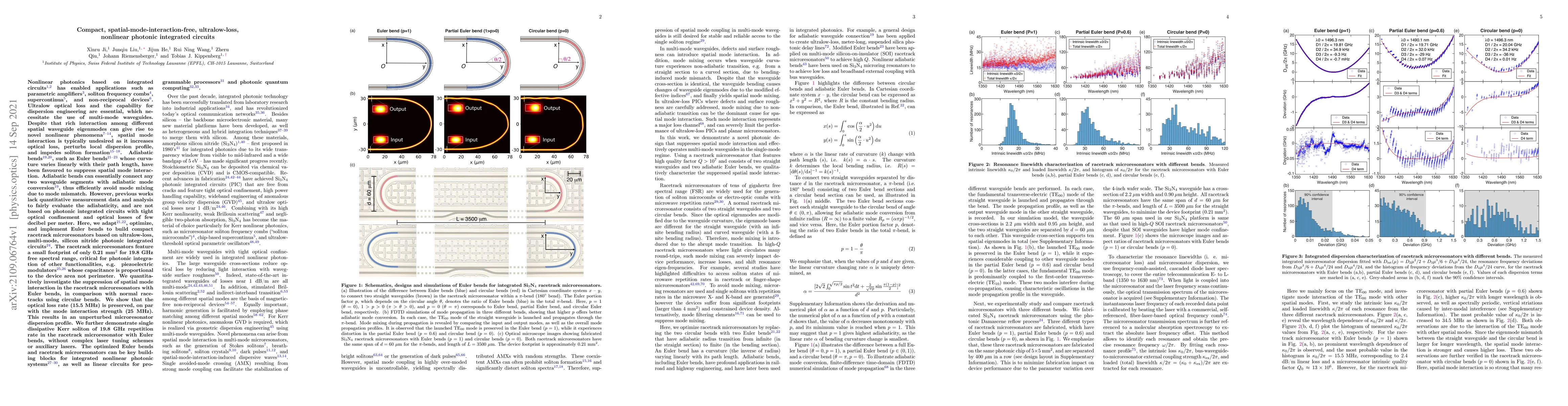 Nonlinear photonics based on integrated circuits has enabled applications such as parametric amplifiers, soliton frequency combs, supercontinua, and non-reciprocal devices. Ultralow optical loss and the capability for dispersion engineering are essential, which necessitate the use of multi-mode waveguides. Despite that rich interaction among different spatial waveguide eigenmodes can give rise to novel nonlinear phenomena, spatial mode interaction is typically undesired as it increases optical loss, perturbs local dispersion profile, and impedes soliton formation. Adiabatic bends, such as Euler bends whose curvature varies linearly with their path length, have been favoured to suppress spatial mode interaction. Adiabatic bends can essentially connect any two waveguide segments with adiabatic mode conversion, thus efficiently avoid mode mixing due to mode mismatch. However, previous works lack quantitative measurement data and analysis to fairly evaluate the adiabaticity, and are not based on photonic integrated circuits with tight optical confinement and optical losses of few dB/m. Here, we adapt, optimize, and implement Euler bends to build compact racetrack microresonators based on ultralow-loss, multi-mode, silicon nitride photonic integrated circuits. The racetrack microresonators feature a small footprint of only 0.21 mm^2 for 19.8 GHz FSR. We quantitatively investigate the suppression of spatial mode interaction in the racetrack microresonators with Euler bends. We show that the optical loss rate (15.5 MHz) is preserved, on par with the mode interaction strength (25 MHz). This results in an unperturbed microresonator dispersion profile. We further demonstrate single soliton of 19.8 GHz repetition rate. The optimized Euler bends and racetrack microresonators can be key building blocks for integrated nonlinear photonic systems, programmable processors and photonic quantum computing.