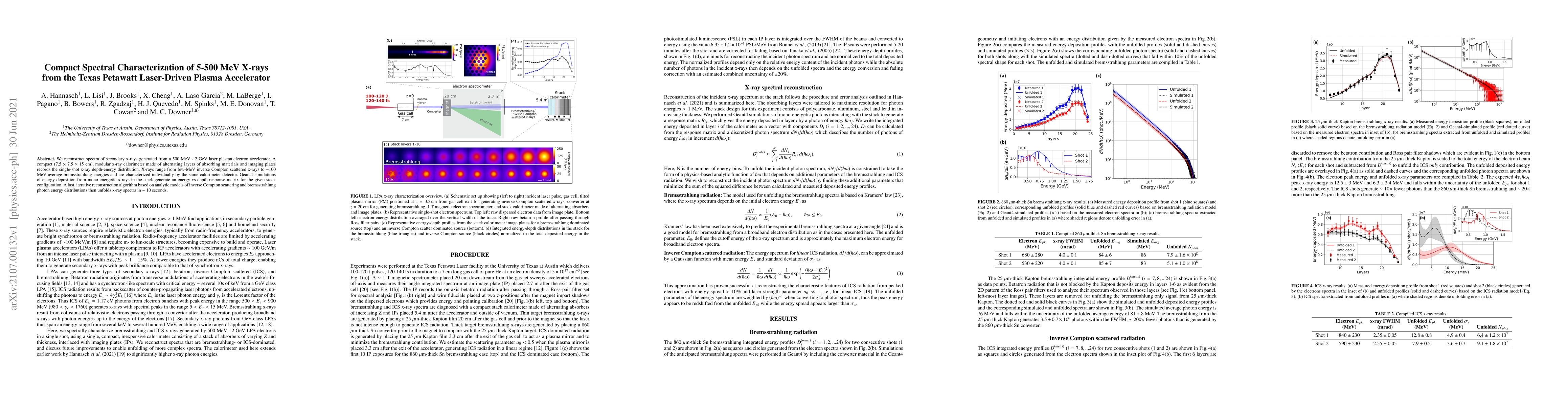 We reconstruct spectra of secondary x-rays generated from a 500 MeV - 2 GeV laser plasma electron accelerator. A compact (7.5 $\times$ 7.5 $\times$ 15 cm), modular x-ray calorimeter made of alternating layers of absorbing materials and imaging plates records the single-shot x-ray depth-energy distribution. X-rays range from few-MeV inverse Compton scattered x-rays to $\sim$100 MeV average bremsstrahlung energies and are characterized individually by the same calorimeter detector. Geant4 simulations of energy deposition from mono-energetic x-rays in the stack generate an energy-vs-depth response matrix for the given stack configuration. A fast, iterative reconstruction algorithm based on analytic models of inverse Compton scattering and bremsstrahlung photon energy distributions then unfolds x-ray spectra in $\sim10$ seconds.