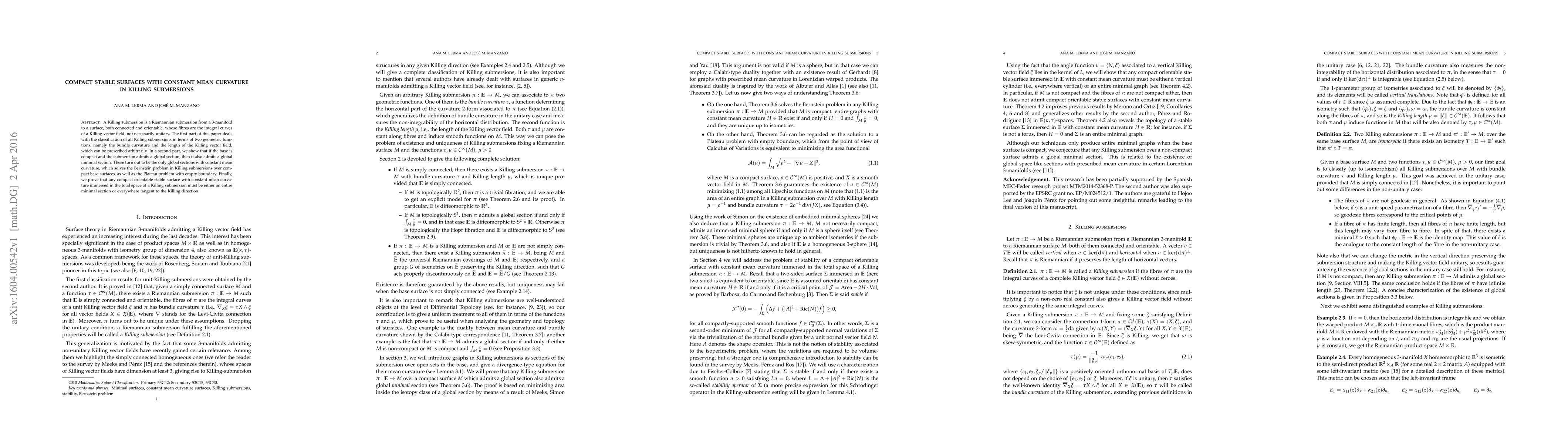 This paper classifies Killing submersions using geometric functions and proves the existence of global minimal sections with constant mean curvature under certain conditions, solving Bernstein and Plateau problems in this context. It also establishes that any compact stable surface with constant mean curvature in such submersions is either an entire minimal section or tangent to the Killing direction.