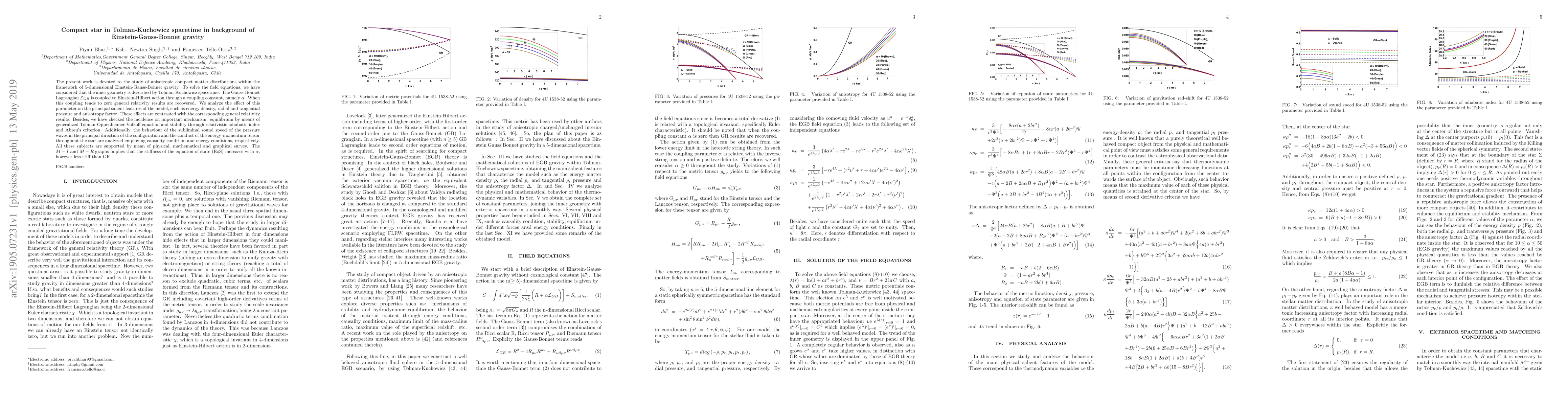 This paper investigates anisotropic compact matter distributions in 5-dimensional Einstein-Gauss-Bonnet gravity using Tolman-Kuchowicz spacetime. It examines the influence of a coupling constant on energy density, pressure, and anisotropy, while also analyzing sound speed and the energy-momentum tensor under causality and energy conditions.