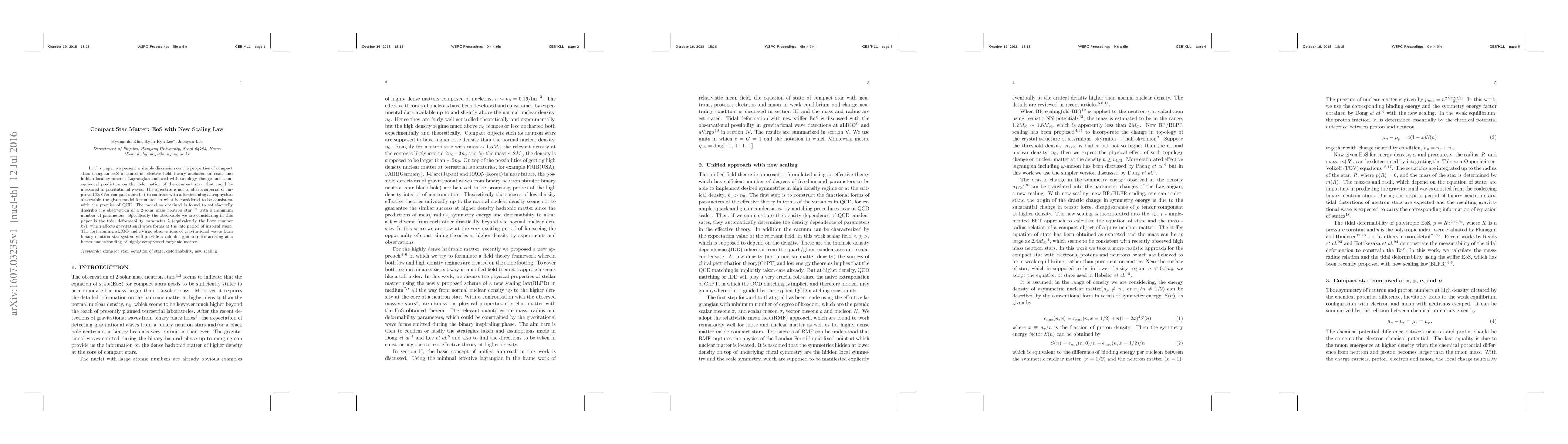 In this paper we present a simple discussion on the properties of compact stars using an EoS obtained in effective field theory anchored on scale and hidden-local symmetric Lagrangian endowed with topology change and a unequivocal prediction on the deformation of the compact star, that could be measured in gravitational waves. The objective is not to offer a superior or improved EoS for compact stars but to confront with a forthcoming astrophysical observable the given model formulated in what is considered to be consistent with the premise of QCD. The model so obtained is found to satisfactorily describe the observation of a 2-solar mass neutron star with a minimum number of parameters. Specifically the observable we are considering in this paper is the tidal deformability parameter (equivalently the Love number k_2), which affects gravitational wave forms at the late period of inspiral stage. The forthcoming aLIGO and aVirgo observations of gravitational waves from binary neutron star system will provide a valuable guidance for arriving at a better understanding of highly compressed baryonic matter.