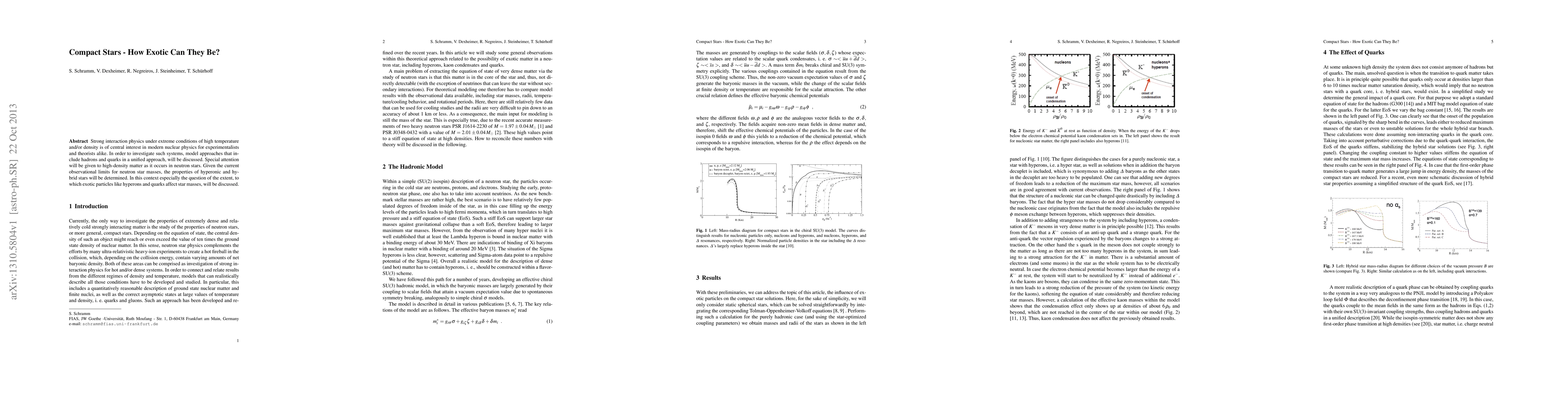 This paper explores the physics of strong interactions in extreme conditions, focusing on neutron stars and the impact of exotic particles like hyperons and quarks on their masses. It discusses model approaches combining hadrons and quarks to understand high-density matter and the implications for neutron star masses.