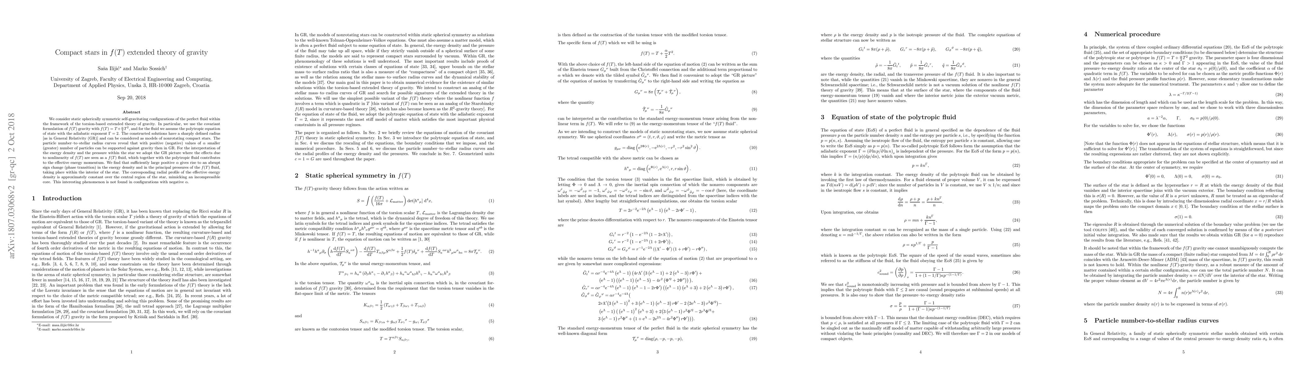 We consider static spherically symmetric self-gravitating configurations of the perfect fluid within the framework of the torsion-based extended theory of gravity. In particular, we use the covariant formulation of $f(T)$ gravity with $f(T) = T + \frac{\alpha}{2} T^2$, and for the fluid we assume the polytropic equation of state with the adiabatic exponent $\Gamma = 2$. The constructed solutions have a sharply defined radius [as in General Relativity (GR)] and can be considered as models of nonrotating compact stars. The particle number--to--stellar radius curves reveal that with positive (negative) values of $\alpha$ smaller (greater) number of particles can be supported against gravity then in GR. For the interpretation of the energy density and the pressure within the star we adopt the GR picture where the effects due to nonlinearity of $f(T)$ are seen as a $f(T)$ fluid, which together with the polytropic fluid contributes to the effective energy momentum. We find that sufficiently large positive $\alpha$ gives rise to an abrupt sign change (phase transition) in the energy density and in the principal pressures of the $f(T)$ fluid, taking place within the interior of the star. The corresponding radial profile of the effective energy density is approximately constant over the central region of the star, mimicking an incompressible core. This interesting phenomenon is not found in configurations with negative $\alpha$.