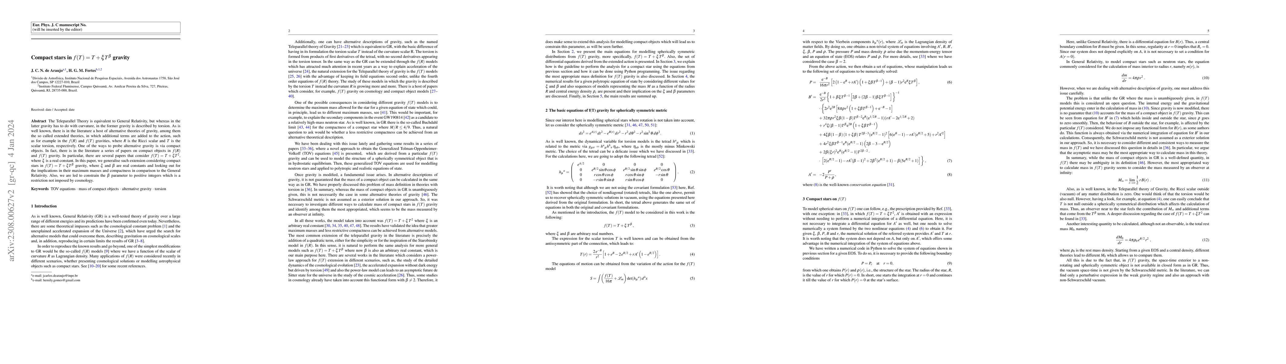 The Teleparallel Theory is equivalent to General Relativity, but whereas in the latter gravity has to do with curvature, in the former gravity is described by torsion. As is well known, there is in the literature a host of alternative theories of gravity, among them the so called extended theories, in which additional terms are added to the action, such as for example in the $f(R)$ and $f(T)$ gravities, where $R$ is the Ricci scalar and $T$ is the scalar torsion, respectively. One of the ways to probe alternative gravity is via compact objects. In fact, there is in the literature a series of papers on compact objects in $f(R)$ and $f(T)$ gravity. In particular, there are several papers that consider $f(T) = T + \xi T^2$, where $\xi$ is a real constant. In this paper, we generalise such extension considering compact stars in $f (T ) = T + \xi T^\beta$ gravity, where $\xi$ and $\beta$ are real constants and looking out for the implications in their maximum masses and compactness in comparison to the General Relativity. Also, we are led to constrain the $\beta$ parameter to positive integers which is a restriction not imposed by cosmology.