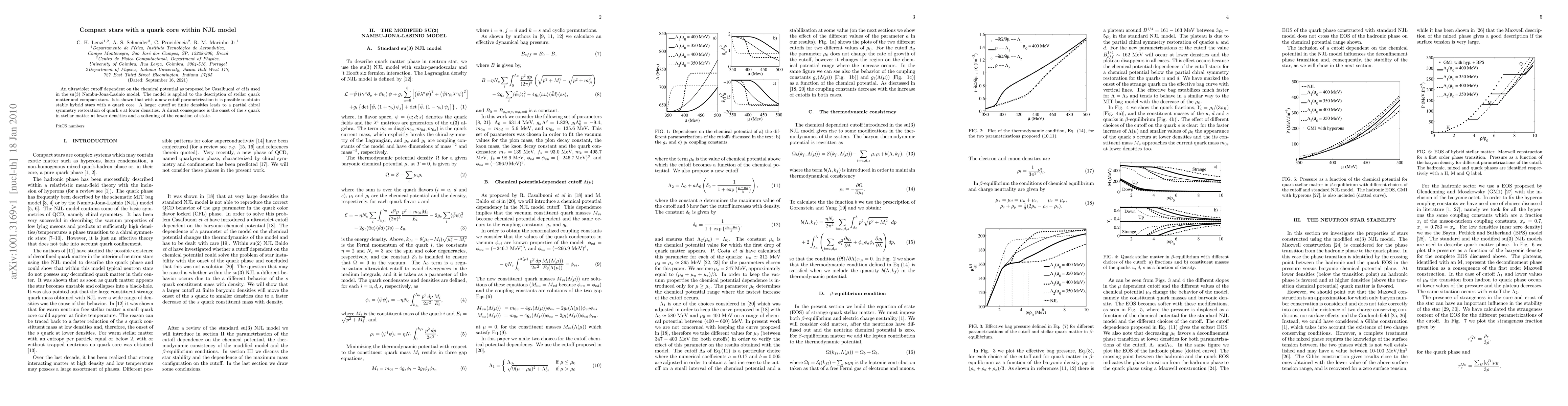 An ultraviolet cutoff dependent on the chemical potential as proposed by Casalbuoni {\it et al} is used in the su(3) Nambu-Jona-Lasinio model. The model is applied to the description of stellar quark matter and compact stars. It is shown that with a new cutoff parametrization it is possible to obtain stable hybrid stars with a quark core. A larger cutoff at finite densities leads to a partial chiral symmetry restoration of quark $s$ at lower densities. A direct consequence is the onset of the $s$ quark in stellar matter at lower densities and a softening of the equation of state.