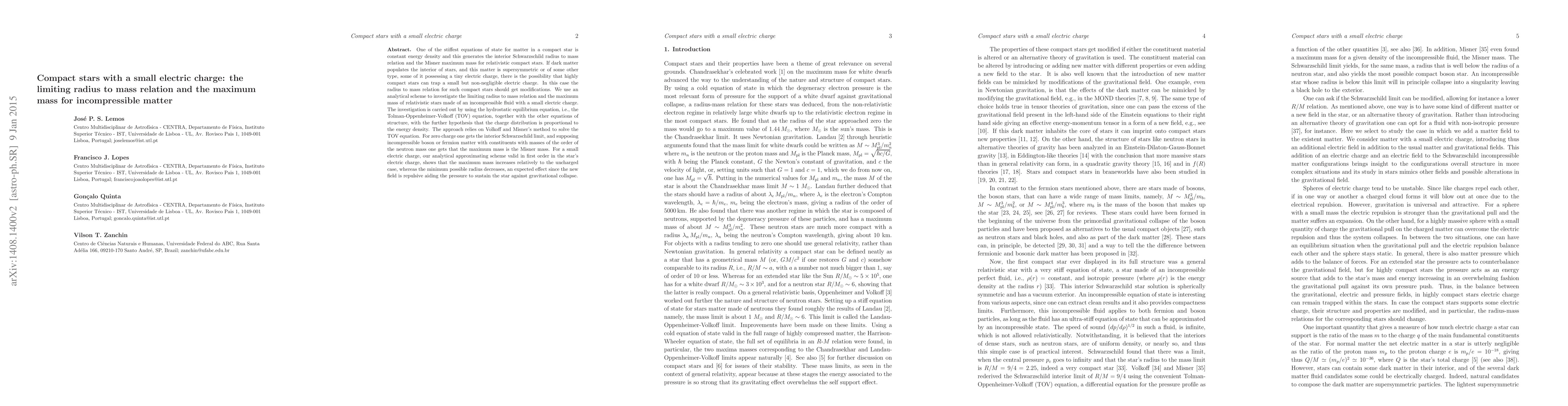 This paper investigates the effects of a small electric charge on compact stars, using an incompressible fluid model and the Tolman-Oppenheimer-Volkoff equation. It finds that a small electric charge increases the maximum mass and decreases the minimum radius of such stars, due to the repulsive effect of the electric field.