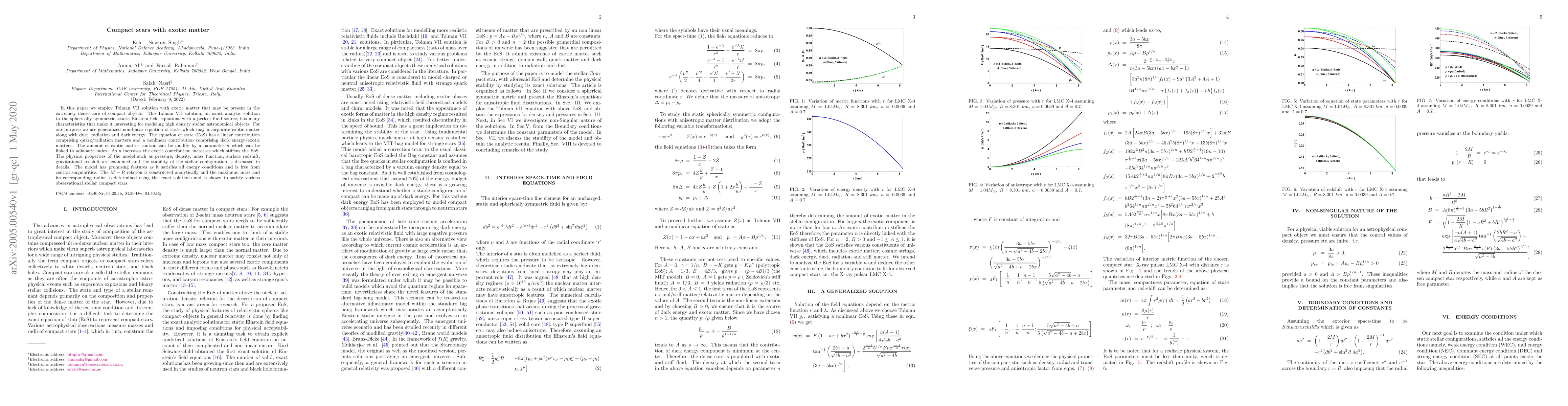 This paper models compact stars using the Tolman VII solution with an exotic matter equation of state, examining physical properties and stability. The model satisfies energy conditions and avoids central singularities, showing promising features for compact stellar objects.