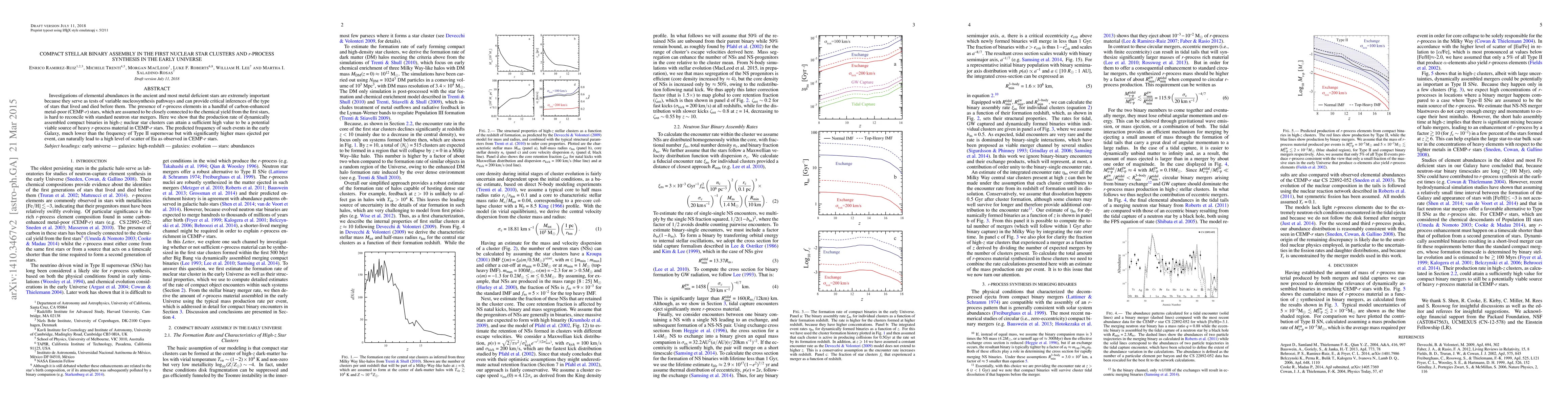 Investigations of elemental abundances in the ancient and most metal deficient stars are extremely important because they serve as tests of variable nucleosynthesis pathways and can provide critical inferences of the type of stars that lived and died before them. The presence of r-process elements in a handful of carbon-enhanced metal-poor (CEMP-r) stars, which are assumed to be closely connected to the chemical yield from the first stars, is hard to reconcile with standard neutron star mergers. Here we show that the production rate of dynamically assembled compact binaries in high-z nuclear star clusters can attain a sufficient high value to be a potential viable source of heavy r-process material in CEMP-r stars. The predicted frequency of such events in the early Galaxy, much lower than the frequency of Type II supernovae but with significantly higher mass ejected per event, can naturally lead to a high level of scatter of Eu as observed in CEMP-r stars.