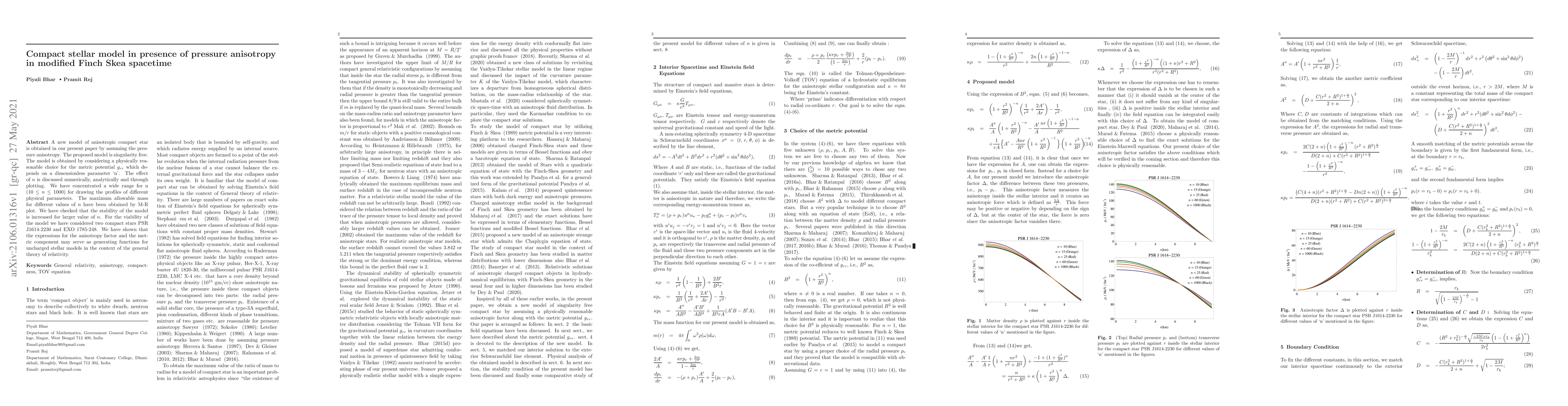A new model of anisotropic compact star is obtained in our present paper by assuming the pressure anisotropy. The proposed model is singularity free. The model is obtained by considering a physically reasonable choice for the metric potential $g_{rr}$ which depends on a dimensionless parameter `n'. The effect of $n$ is discussed numerically, analytically and through plotting. We have concentrated a wide range for n ($10\leq n \leq 1000$) for drawing the profiles of different physical parameters. The maximum allowable mass for different values of $n$ have been obtained by M-R plot. We have checked that the stability of the model is increased for larger value of $n$. For the viability of the model we have considered two compact stars PSR J1614-2230 and EXO 1785-248. We have shown that the expressions for the anisotropy factor and the metric component may serve as generating functions for uncharged stellar models in the context of the general theory of relativity.