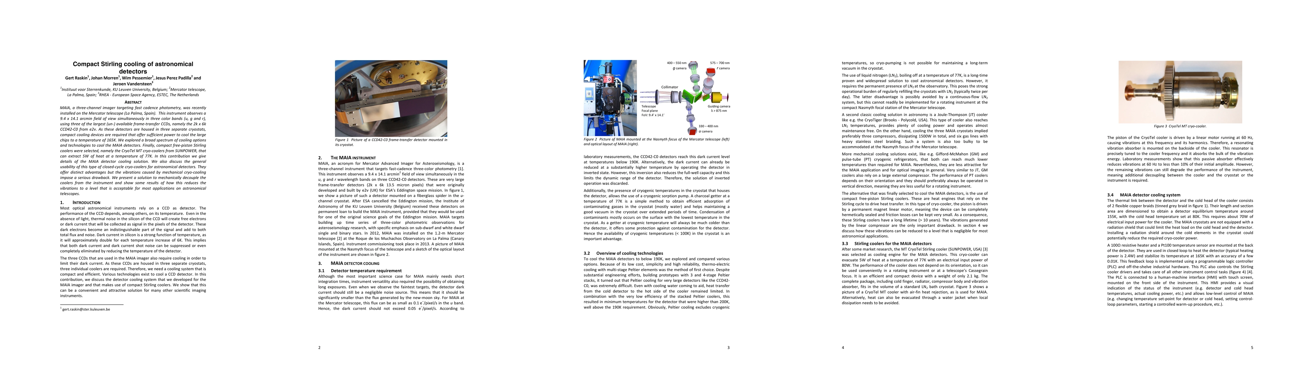 MAIA, a three-channel imager targeting fast cadence photometry, was recently installed on the Mercator telescope (La Palma, Spain). This instrument observes a 9.4 x 14.1 arcmin field of view simultaneously in three color bands ($u$, $g$ and $r$), using three of the largest (un-) available frame-transfer CCDs, namely the 2k x 6k CCD42-C0 from e2v. As these detectors are housed in three separate cryostats, compact cooling devices are required that offer sufficient power to cool the large chips to a temperature of 165K. We explored a broad spectrum of cooling options and technologies to cool the MAIA detectors. Finally, compact free-piston Stirling coolers were selected, namely the CryoTel MT cryo-coolers from SUNPOWER, that can extract 5W of heat at a temperature of 77K. In this contribution we give details of the MAIA detector cooling solution. We also discuss the general usability of this type of closed-cycle cryo-coolers for astronomical detectors. They offer distinct advantages but the vibrations caused by mechanical cryo-cooling impose a serious drawback. We present a solution to mechanically decouple the coolers from the instrument and show some results of how this reduces the vibrations to a level that is acceptable for most applications on astronomical telescopes.