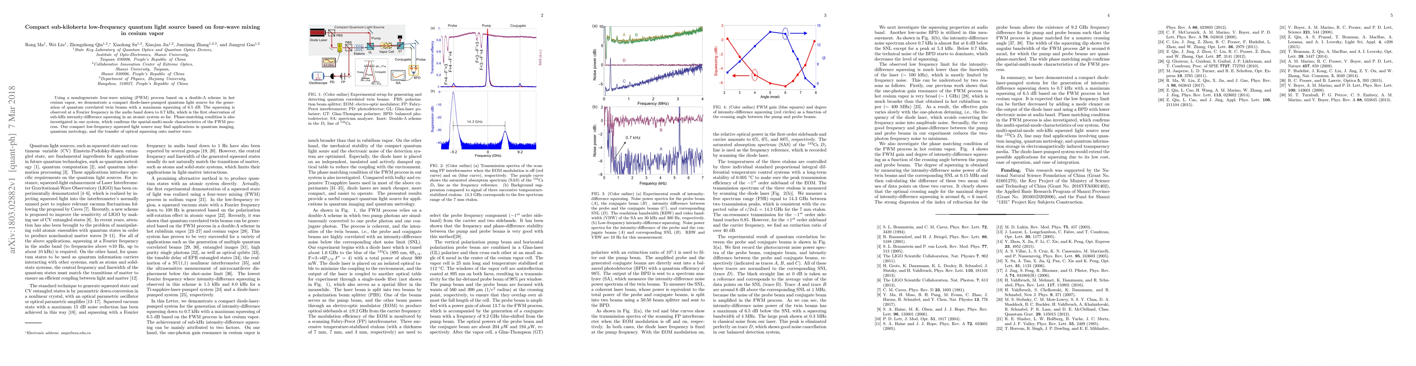 This paper presents a compact quantum light source utilizing nondegenerate four-wave mixing in cesium vapor to generate twin beams with a maximum squeezing of 6.5 dB at sub-kilohertz frequencies, marking the first observation of such low-frequency intensity-difference squeezing in an atomic system. The study also investigates the phase-matching conditions, highlighting potential applications in quantum imaging and metrology.