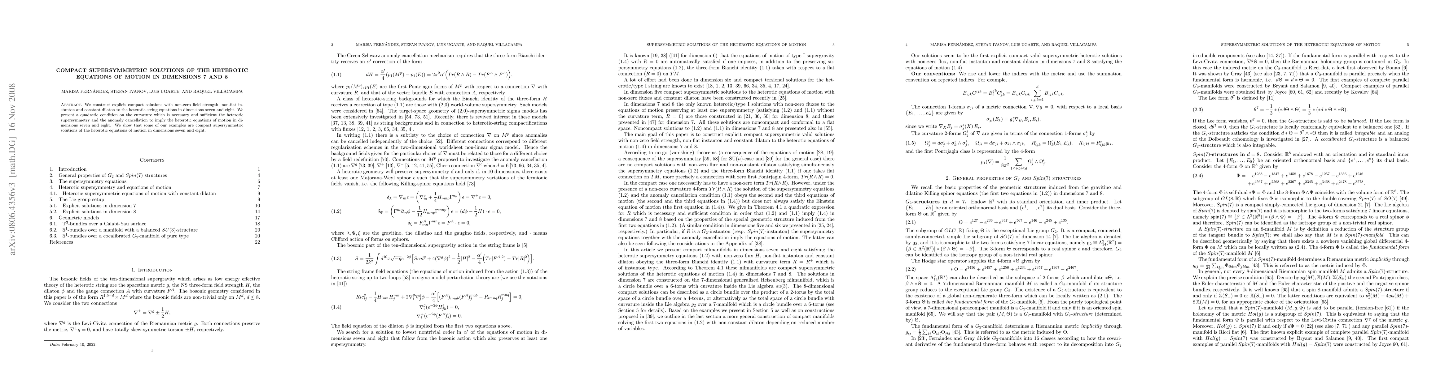 This paper constructs explicit compact supersymmetric solutions to the heterotic string equations in dimensions seven and eight, featuring non-zero field strength, non-flat instanton, and constant dilaton. It also presents a quadratic curvature condition necessary for heterotic supersymmetry and anomaly cancellation.