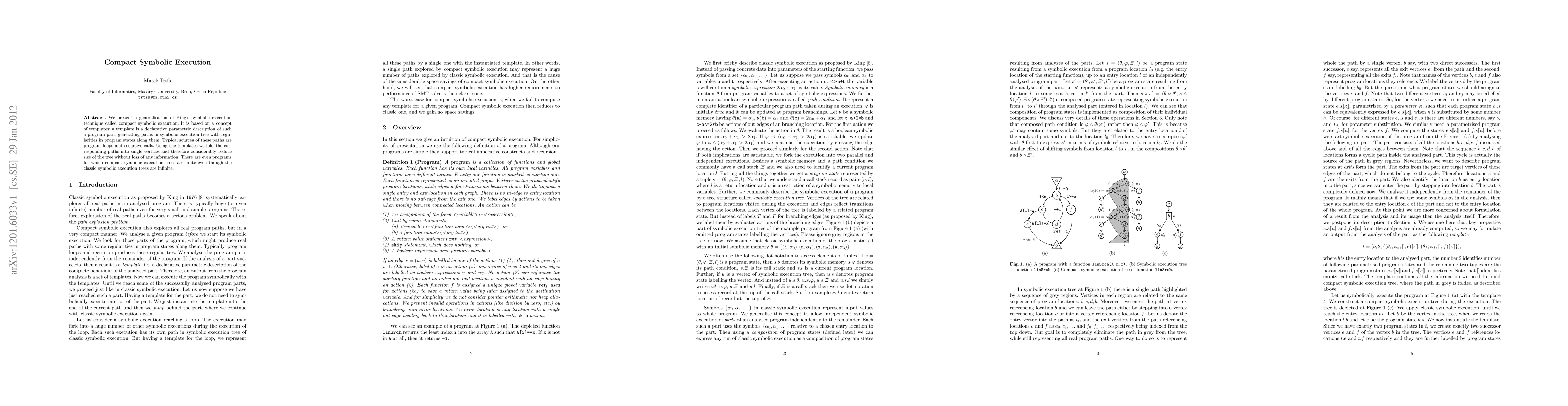 This paper introduces compact symbolic execution, a generalization of King's symbolic execution technique that uses templates to represent regularities in program states, significantly reducing the size of the symbolic execution tree without losing information. This method can even produce finite trees for programs where traditional symbolic execution would generate infinite ones.
