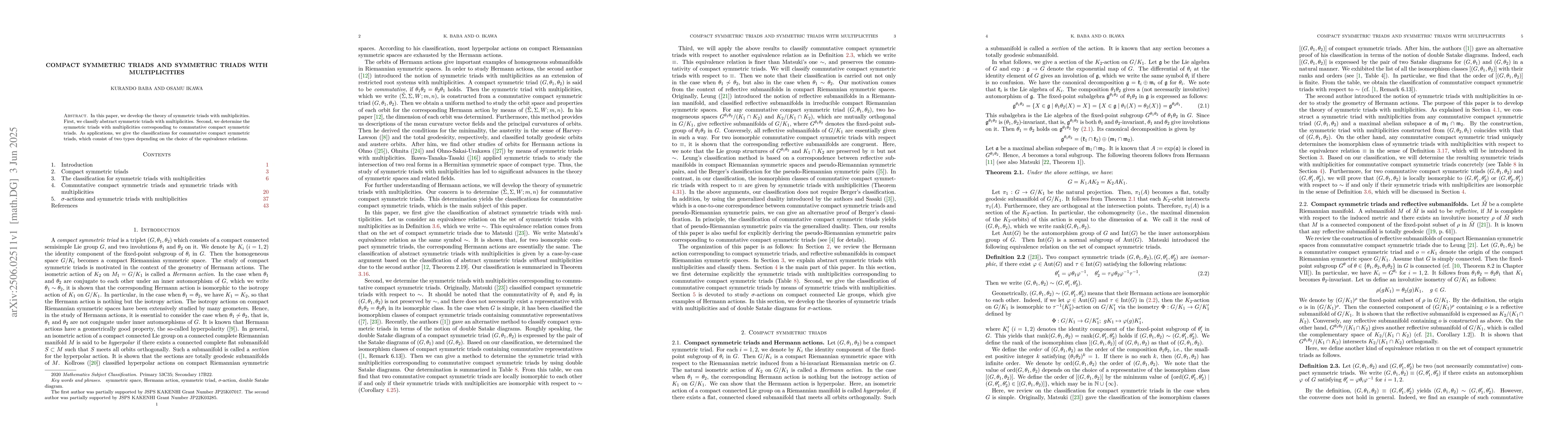 The paper develops the theory of symmetric triads with multiplicities by classifying abstract symmetric triads with multiplicities and determining those corresponding to commutative compact symmetric triads.