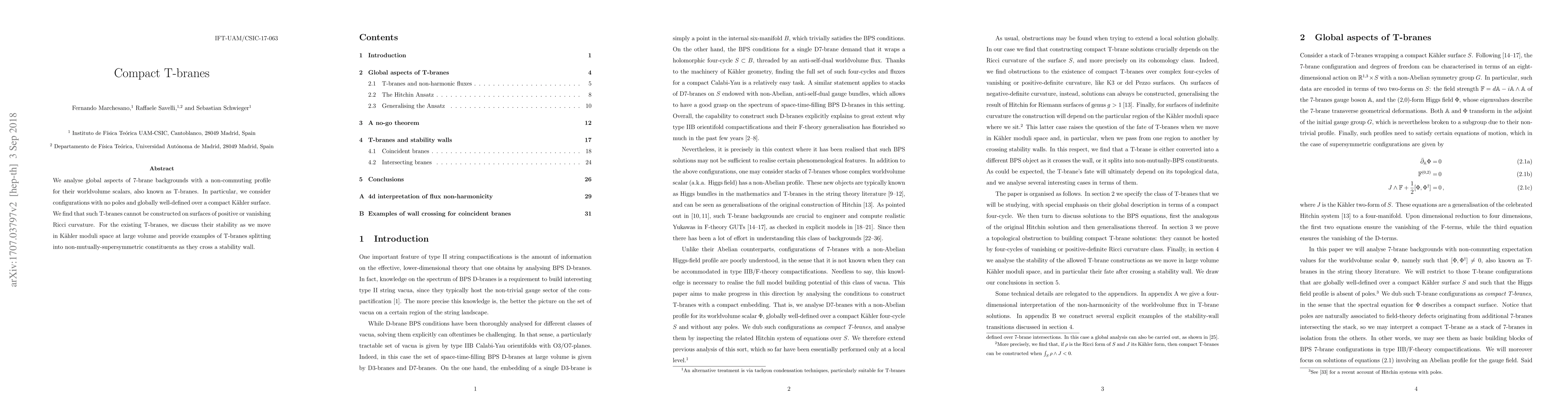 We analyse global aspects of 7-brane backgrounds with a non-commuting profile for their worldvolume scalars, also known as T-branes. In particular, we consider configurations with no poles and globally well-defined over a compact K\"ahler surface. We find that such T-branes cannot be constructed on surfaces of positive or vanishing Ricci curvature. For the existing T-branes, we discuss their stability as we move in K\"ahler moduli space at large volume and provide examples of T-branes splitting into non-mutually-supersymmetric constituents as they cross a stability wall.