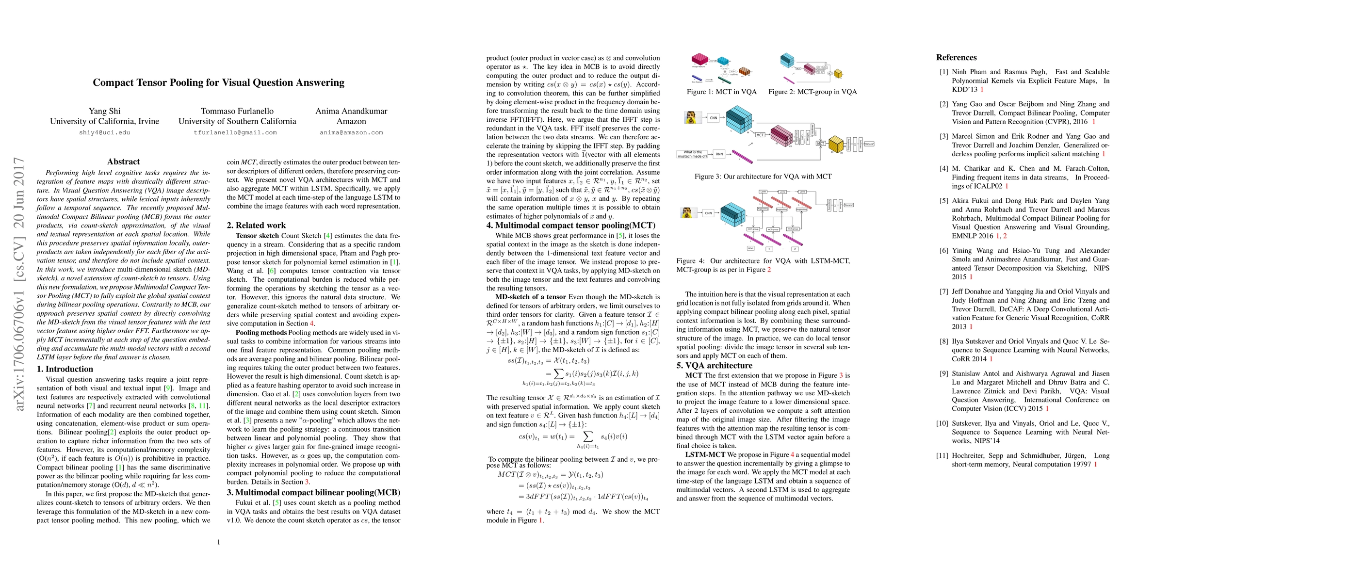 Performing high level cognitive tasks requires the integration of feature maps with drastically different structure. In Visual Question Answering (VQA) image descriptors have spatial structures, while lexical inputs inherently follow a temporal sequence. The recently proposed Multimodal Compact Bilinear pooling (MCB) forms the outer products, via count-sketch approximation, of the visual and textual representation at each spatial location. While this procedure preserves spatial information locally, outer-products are taken independently for each fiber of the activation tensor, and therefore do not include spatial context. In this work, we introduce multi-dimensional sketch ({MD-sketch}), a novel extension of count-sketch to tensors. Using this new formulation, we propose Multimodal Compact Tensor Pooling (MCT) to fully exploit the global spatial context during bilinear pooling operations. Contrarily to MCB, our approach preserves spatial context by directly convolving the MD-sketch from the visual tensor features with the text vector feature using higher order FFT. Furthermore we apply MCT incrementally at each step of the question embedding and accumulate the multi-modal vectors with a second LSTM layer before the final answer is chosen.
