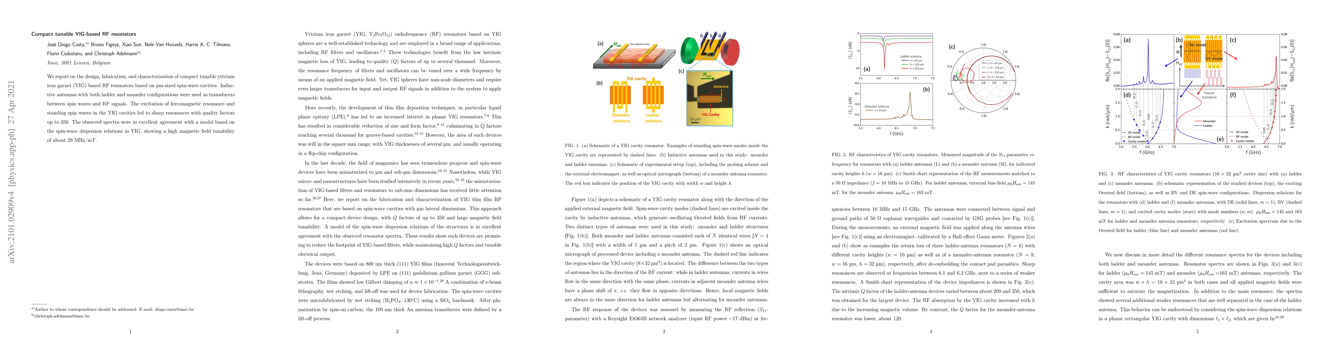 We report on the design, fabrication, and characterization of compact tunable yttrium iron garnet (YIG) based RF resonators based on $\mu$m-sized spin-wave cavities. Inductive antennas with both ladder and meander configurations were used as transducers between spin waves and RF signals. The excitation of ferromagnetic resonance and standing spin waves in the YIG cavities led to sharp resonances with quality factors up to 350. The observed spectra were in excellent agreement with a model based on the spin-wave dispersion relations in YIG, showing a high magnetic field tunability of about 29 MHz/mT.