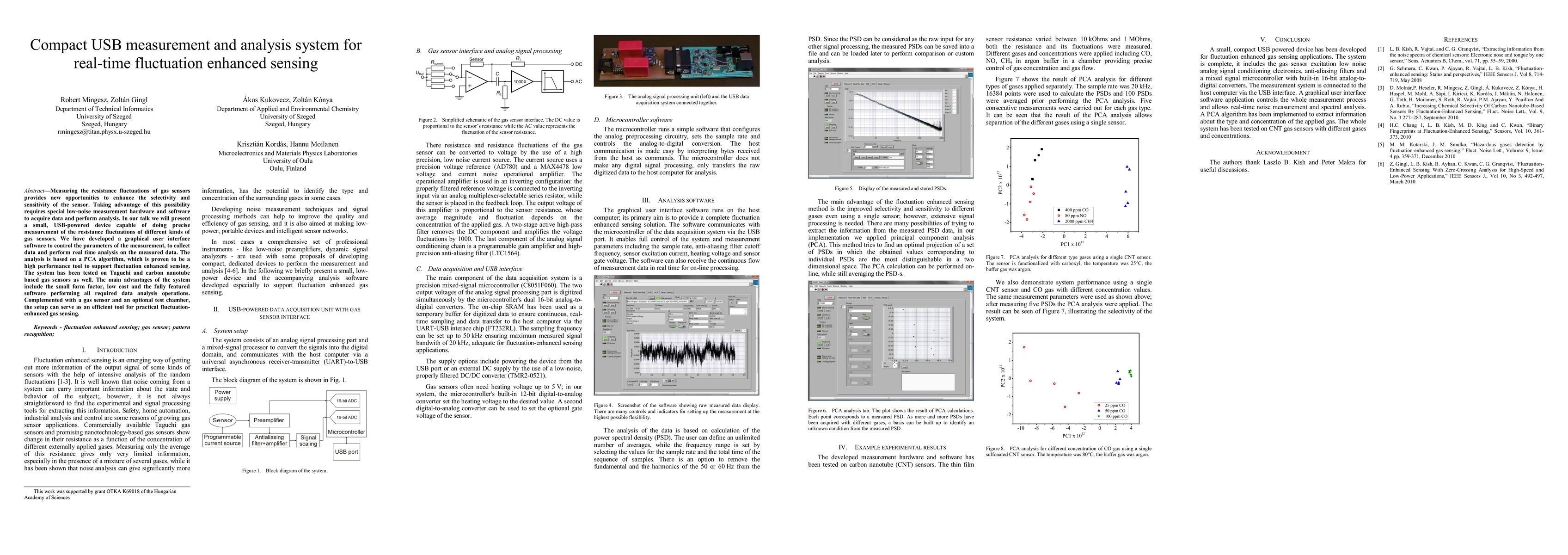 Measuring the resistance fluctuations of gas sensors provides new opportunities to enhance the selectivity and sensitivity of the sensor. Taking advantage of this possibility requires special low-noise measurement hardware and software to acquire data and perform analysis. In this paper we will present a small, USB-powered device capable of doing precise measurement of the resistance fluctuations of different kinds of gas sensors. We have developed a graphical user interface software to control the parameters of the measurement, to collect data and perform real time analysis on the measured data. The analysis is based on a PCA algorithm, which is proven to be a high performance tool to support fluctuation enhanced sensing. The system has been tested on Taguchi and carbon nanotube based gas sensors as well. The main advantages of the system include the small form factor, low cost and the fully featured software performing all required data analysis operations. Complemented with a gas sensor and an optional test chamber, the setup can serve as an efficient tool for practical fluctuation-enhanced gas sensing.