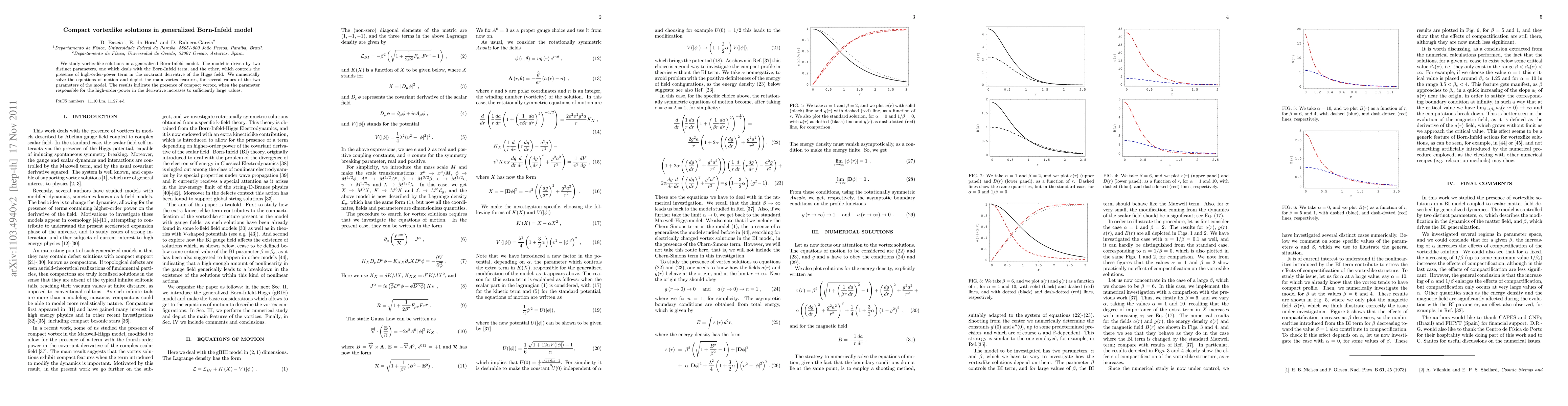 We study vortexlike solutions in a generalized Born-Infeld model. The model is driven by two distinct parameters, one which deals with the Born-Infeld term, and the other, which controls the presence of high-order power term in the covariant derivative of the Higgs field. We numerically solve the equations of motion and depict the main vortex features, for several values of the two parameters of the model. The results indicate the presence of compact vortex, when the parameter responsible for the high-order power in the derivative increases to sufficiently large values.