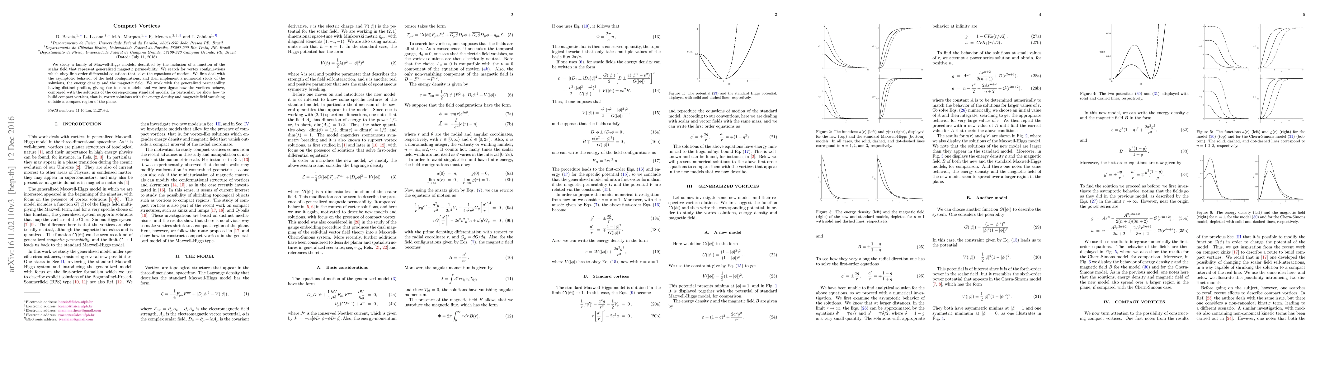 We study a family of Maxwell-Higgs models, described by the inclusion of a function of the scalar field that represent generalized magnetic permeability. We search for vortex configurations which obey first-order differential equations that solve the equations of motion. We first deal with the asymptotic behavior of the field configurations, and then implement a numerical study of the solutions, the energy density and the magnetic field. We work with the generalized permeability having distinct profiles, giving rise to new models, and we investigate how the vortices behave, compared with the solutions of the corresponding standard models. In particular, we show how to build compact vortices, that is, vortex solutions with the energy density and magnetic field vanishing outside a compact region of the plane.