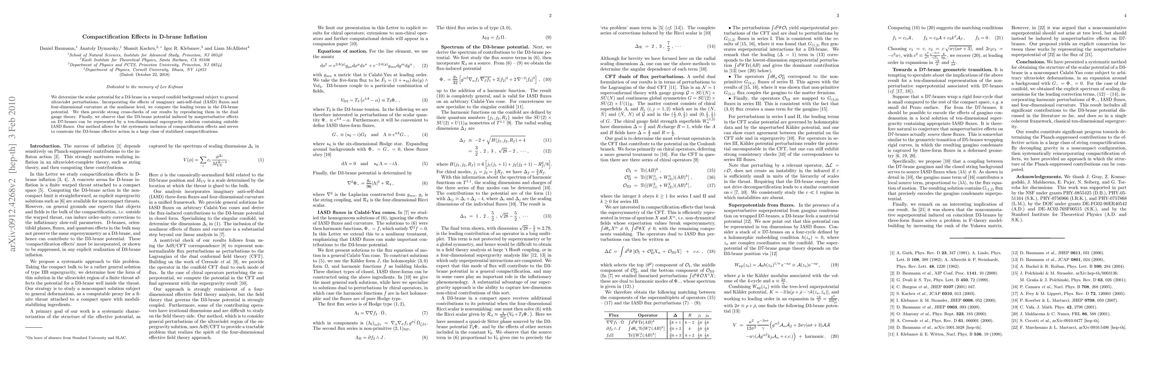 We determine the scalar potential for a D3-brane in a warped conifold background subject to general ultraviolet perturbations. Incorporating the effects of imaginary anti-self-dual (IASD) fluxes and four-dimensional curvature at the nonlinear level, we compute the leading terms in the D3-brane potential. We then provide strong cross-checks of our results by reproducing them in the dual gauge theory. Finally, we observe that the D3-brane potential induced by nonperturbative effects on D7-branes can be represented by a ten-dimensional supergravity solution containing suitable IASD fluxes. Our method allows for the systematic inclusion of compactification effects and serves to constrain the D3-brane effective action in a large class of stabilized compactifications.