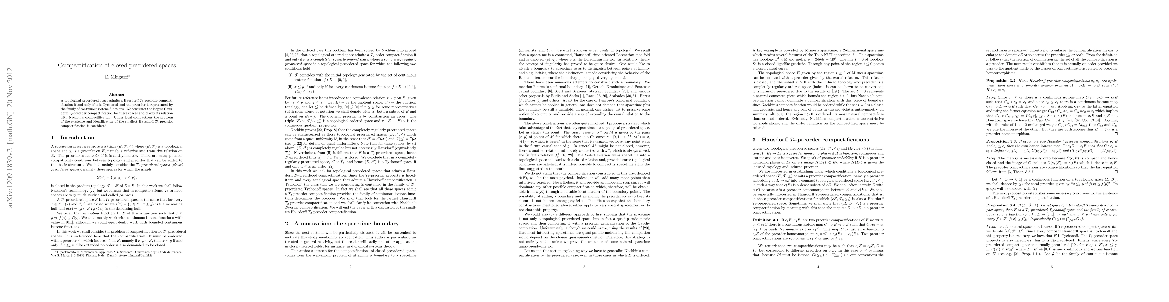 The research investigates the compactification of topological preordered spaces, focusing on the existence and properties of Hausdorff closed preorder compactifications for T2-preordered Tychonoff spaces where the preorder is represented by continuous isotone functions.