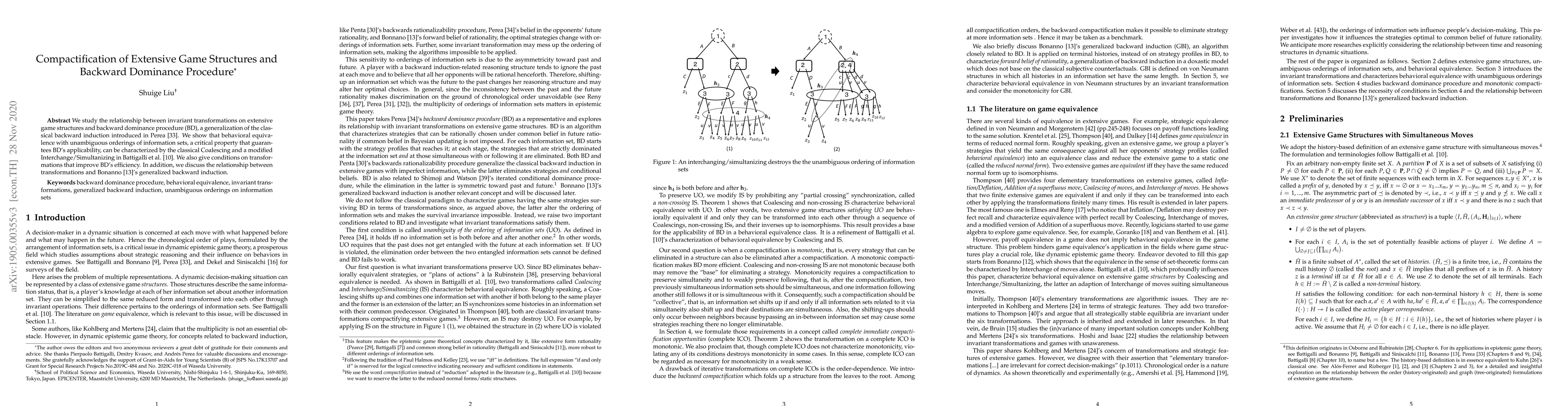 We study the relationship between invariant transformations on extensive game structures and backward dominance procedure (BD), a generalization of the classical backward induction introduced in Perea (2014). We show that behavioral equivalence with unambiguous orderings of information sets, a critical property that guarantees BD's applicability, can be characterized by the classical Coalescing and a modified Interchange/Simultanizing in Battigalli et al. (2020). We also give conditions on transformations that improve BD's efficiency. In addition, we discuss the relationship between transformations and Bonanno (2014)'s generalized backward induction.