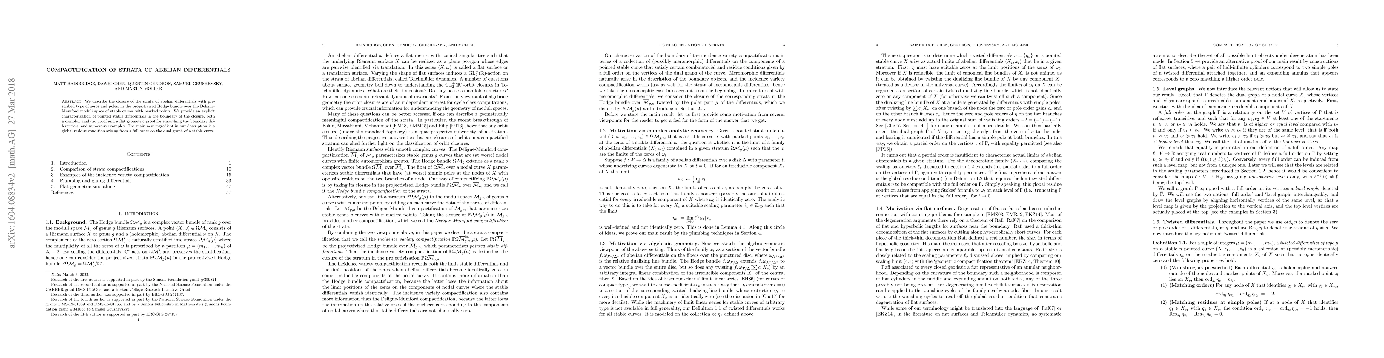 The paper employs both complex analytic and flat geometric methods to describe the compactification of strata of abelian differentials, characterizing pointed stable differentials on the boundary, and providing explicit proofs and examples.