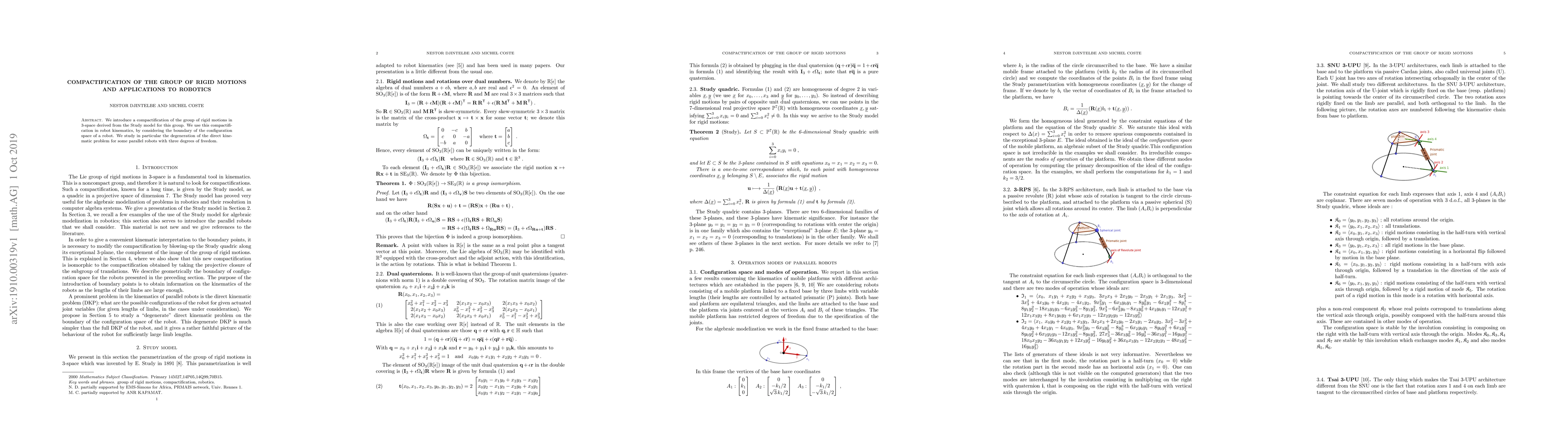 We introduce a compactification of the group of rigid motions in 3-space derived from the Study model for this group. We use this compactifi-cation in robot kinematics, by considering the boundary of the configuration space of a robot. We study in particular the degeneration of the direct kine-matic problem for some parallel robots with three degrees of freedom.